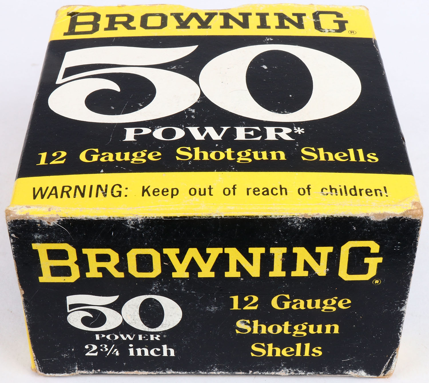Browning, 50 Power, 12ga., 1pc., Full with 16rds being correct shot size, shot size 6, 2 3/4'', black, yellow & white box, box is solid with nice color, shells are excellent. Grade: Excellent - Value: 10 to 50