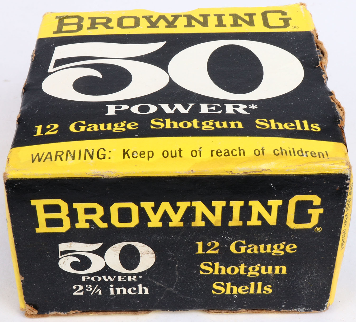 Browning, 50 Power, 12ga., 1pc., FULL, shot size 7 1/2, 2 3/4'', black, yellow & white box, box is solid with shell protrusion & nice color, shells are excellent. Grade: Excellent - Value: 20 to 60
