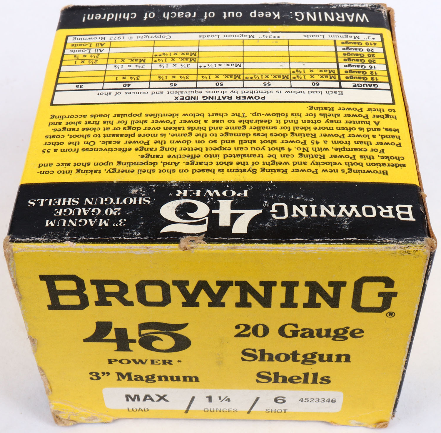 Browning, 45 Power, 20ga., 1pc., FULL, shot size 6, 3'', black, yellow & white box, box is solid with & great color, shells are excellent. Grade: Excellent - Value: 10 to 60