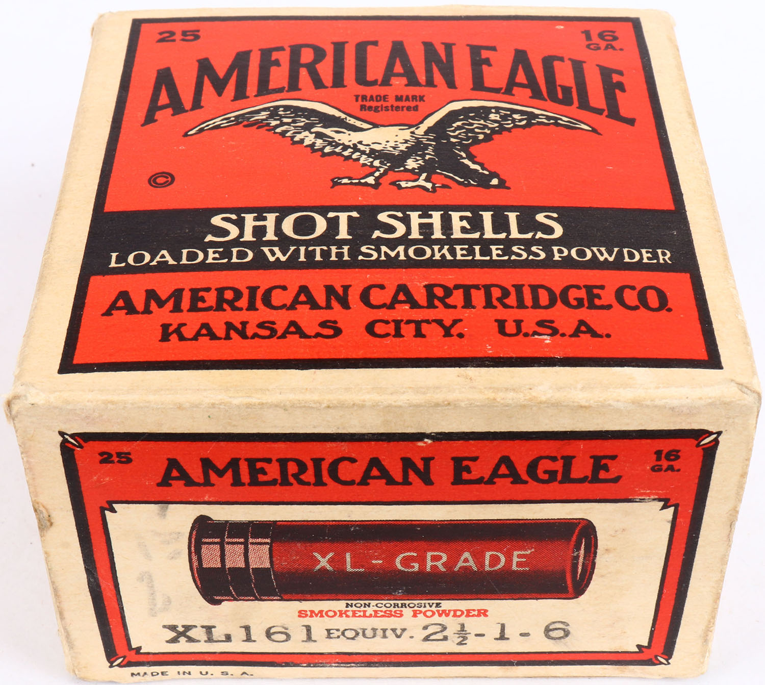 American Cart. Co., XL-Grade, 16ga., 1pc., Partial 13rds with 11rds being correct shot size, shot size 6, buff, red & black box that pictures a flying eagle, box is solid, has bottom flap almost disconnected with great colors, Shells are excellent. Grade: Excellent - Value: 30 to 100