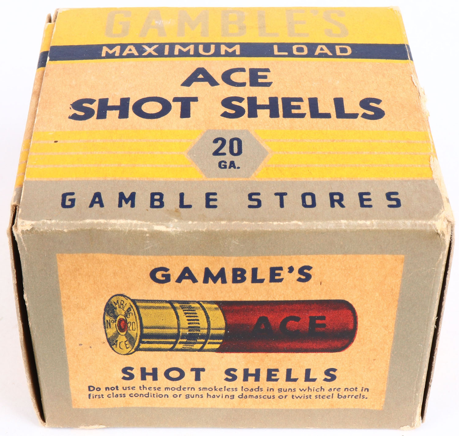 Gambles, ACE Shot Shells, 20ga., 1pc., Empty, shot size 6, buff, blue, yellow & grey box, box has light age soiling and has inside flap almost disconnected with great colors. Grade: Excellent - Value: 20 to 80