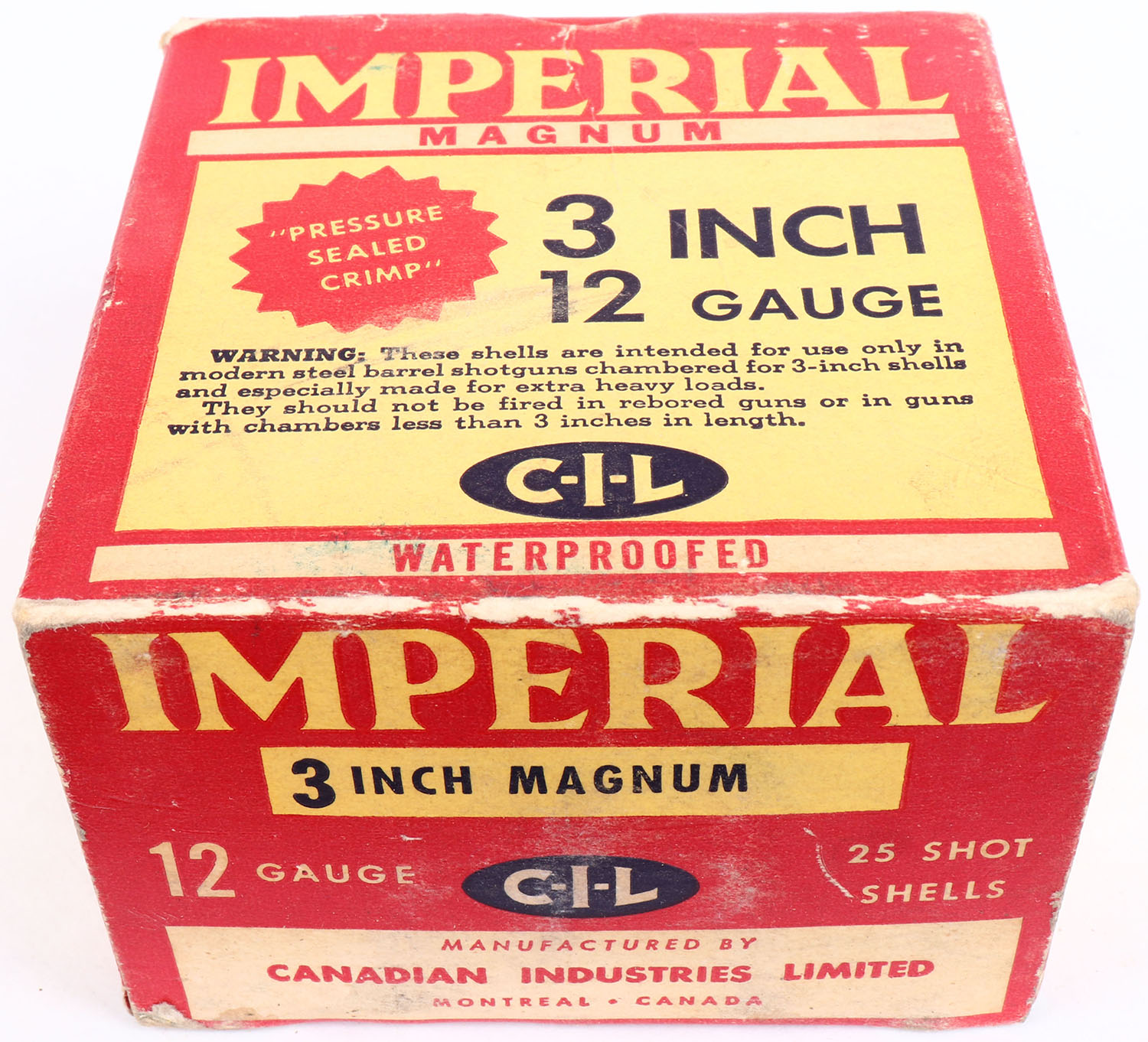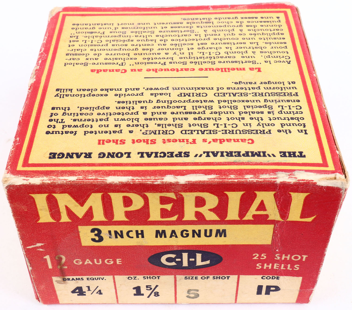 Imperial, 12ga., 1pc., Full, shot size 5, multi-colored box, box is very solid, shells are excellent. Grade: Excellent + - Value: 10 to 20