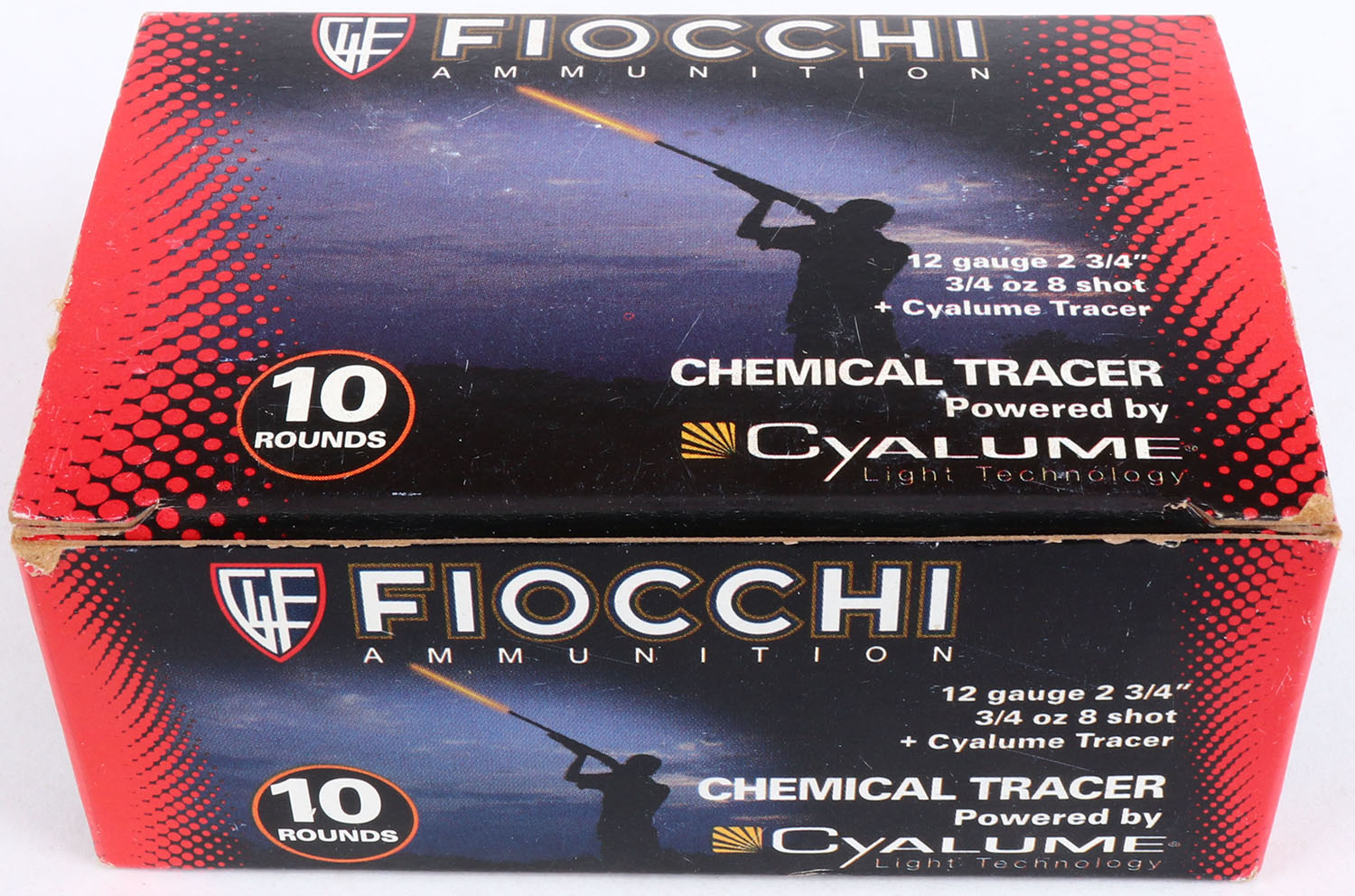 Fiocchi, 12ga., 1pc., Full, shot size 8 Chemical Tracer, multi-colored box, box is very solid, shells are excellent. Grade: Excellent + - Value: 4 to 20