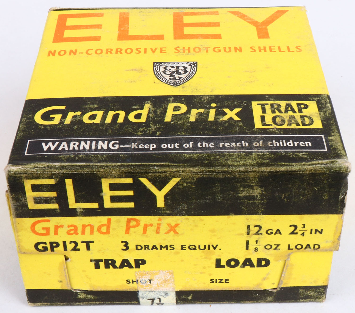 Eley, 12ga., 1pc., Full, shot size 7 1/2 Trap Load, multi-colored box, box is very solid, Shells are excellent. Grade: Excellent + - Value: 10 to 20