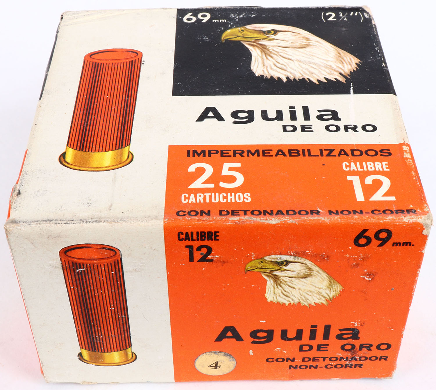 Aguila, 12ga., 1pc., Full, shot size 4, multi-colored box, box is solid, Shells are excellent. Grade: Excellent + - Value: 10 to 20