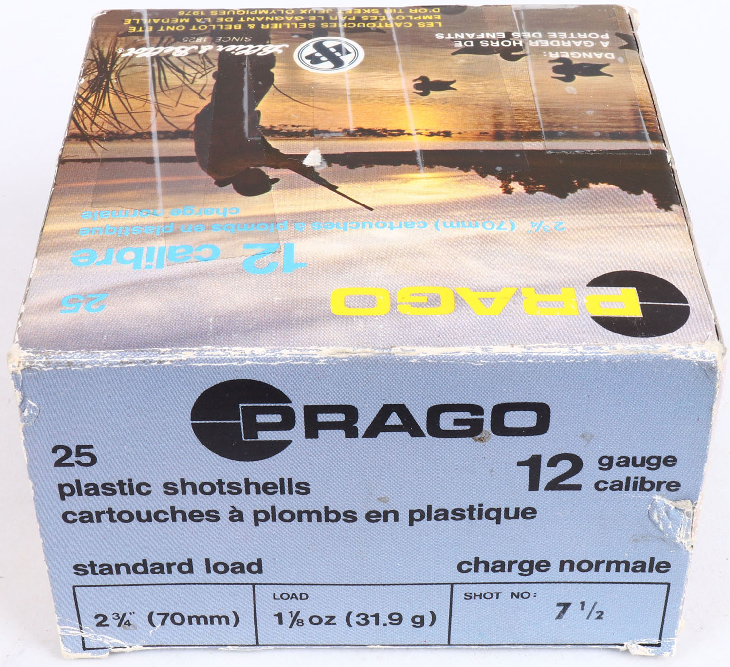 Prago, 12ga., 1pc., Full, shot size 7 1/2, multi-colored box, box is solid, Shells are excellent. Grade: Excellent + - Value: 10 to 20