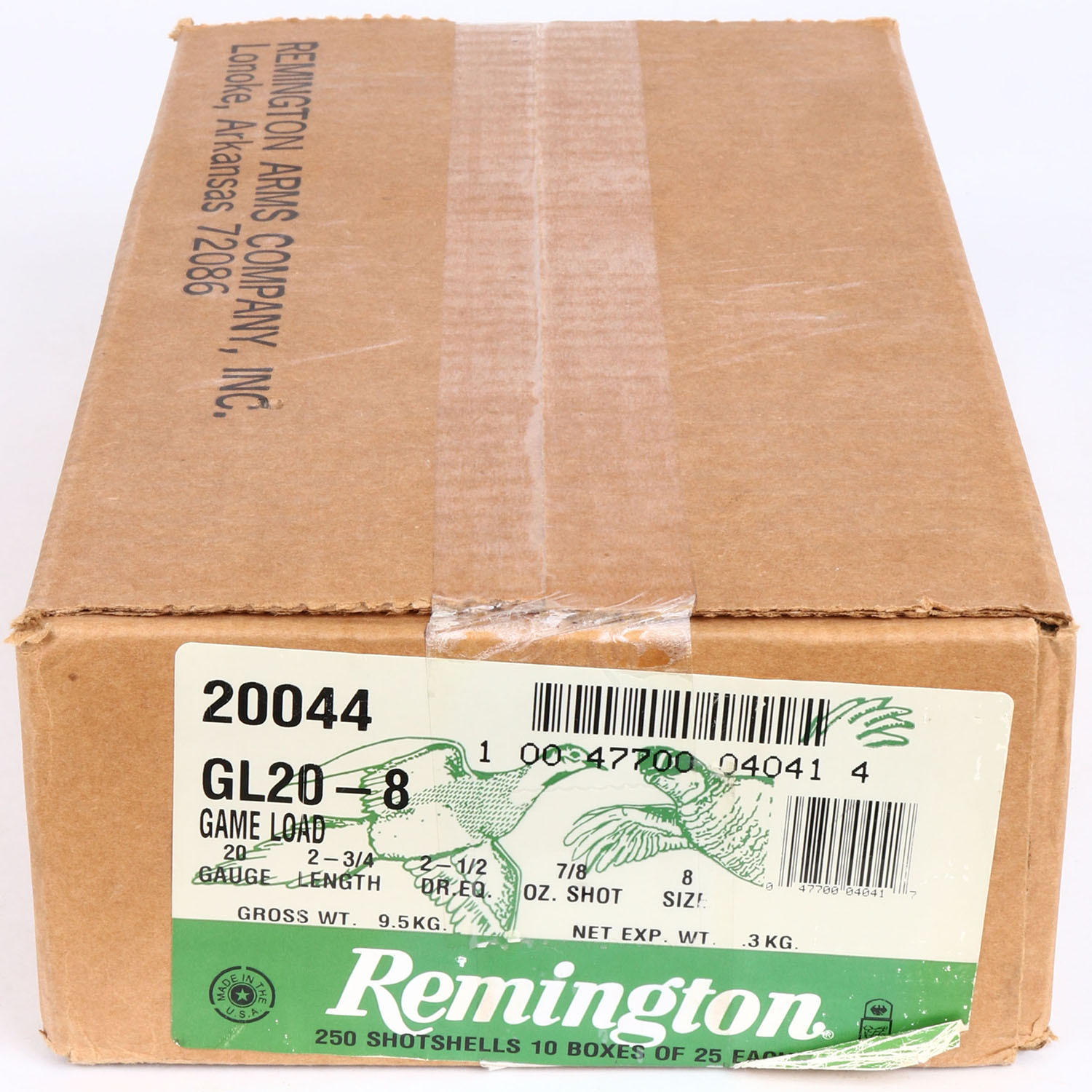 Remington, 20ga., 1pc., FULL & SEALED case of 10 boxes, 250rds, shot size 8, box is very solid. Grade: Excellent + - Value: 50 to 150