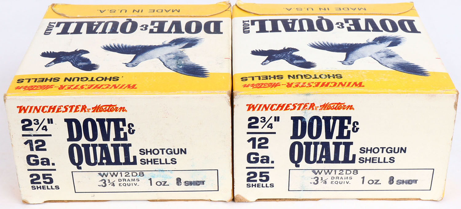 Lot of 2 Winchester-Western, Dove & Quail, 12ga., 1pc., Appears Full with mixed brands, 2 3/4'', shot size 8, multi-colored box, shells are excellent. Grade: Excellent + - Value: 8 to 20