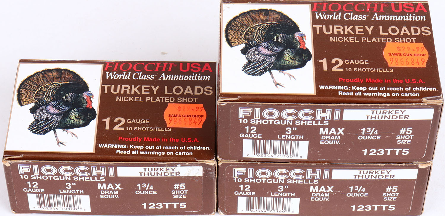 Lot of 2 Fiocchi Turkey Loads, 12ga., 1pc., Appears Full, 3'', shot size 5, multi-colored box, shells are excellent. Grade: Excellent + - Value: 10 to 20