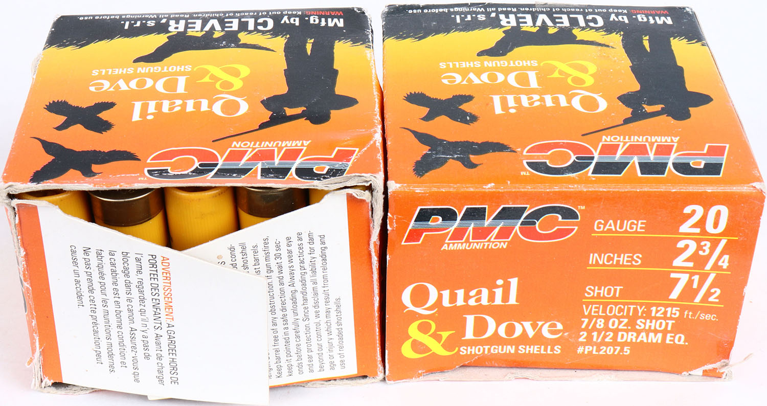 Lot of 2 PMC, Quail & Dove Load, 20ga., 1pc., Appears Partail with mixed brand, 2 3/4'', shot size 7 1/2, multi-colored box, shells are excellent. Grade: Excellent - Value: 8 to 20