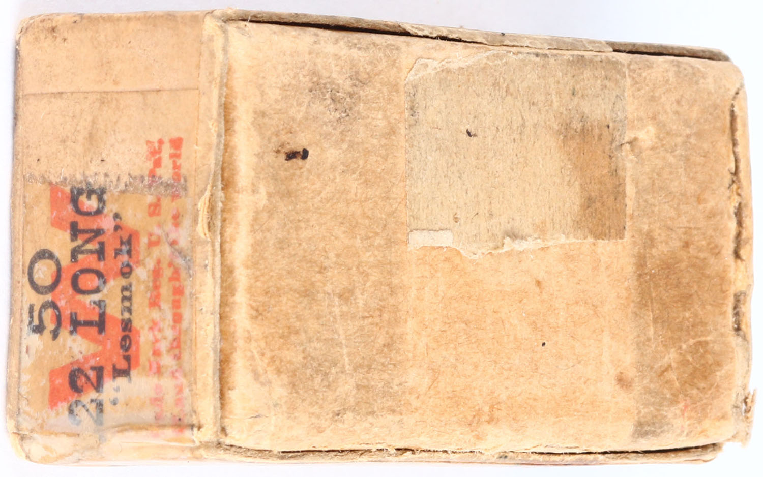 Winchester, ''Lesmok'' Rifle Cartridges, .22 Long, RR: WRA-87 L-30, Full, 2pc. Buff box with green top & buff side labels, box is solid with good color, vertical seam splits to front corners of lid that have been taped, edge wear, age soiling, corner wear, label is 90% intact, ammo is very good. Grade: Very Good - Value: 10 to 50