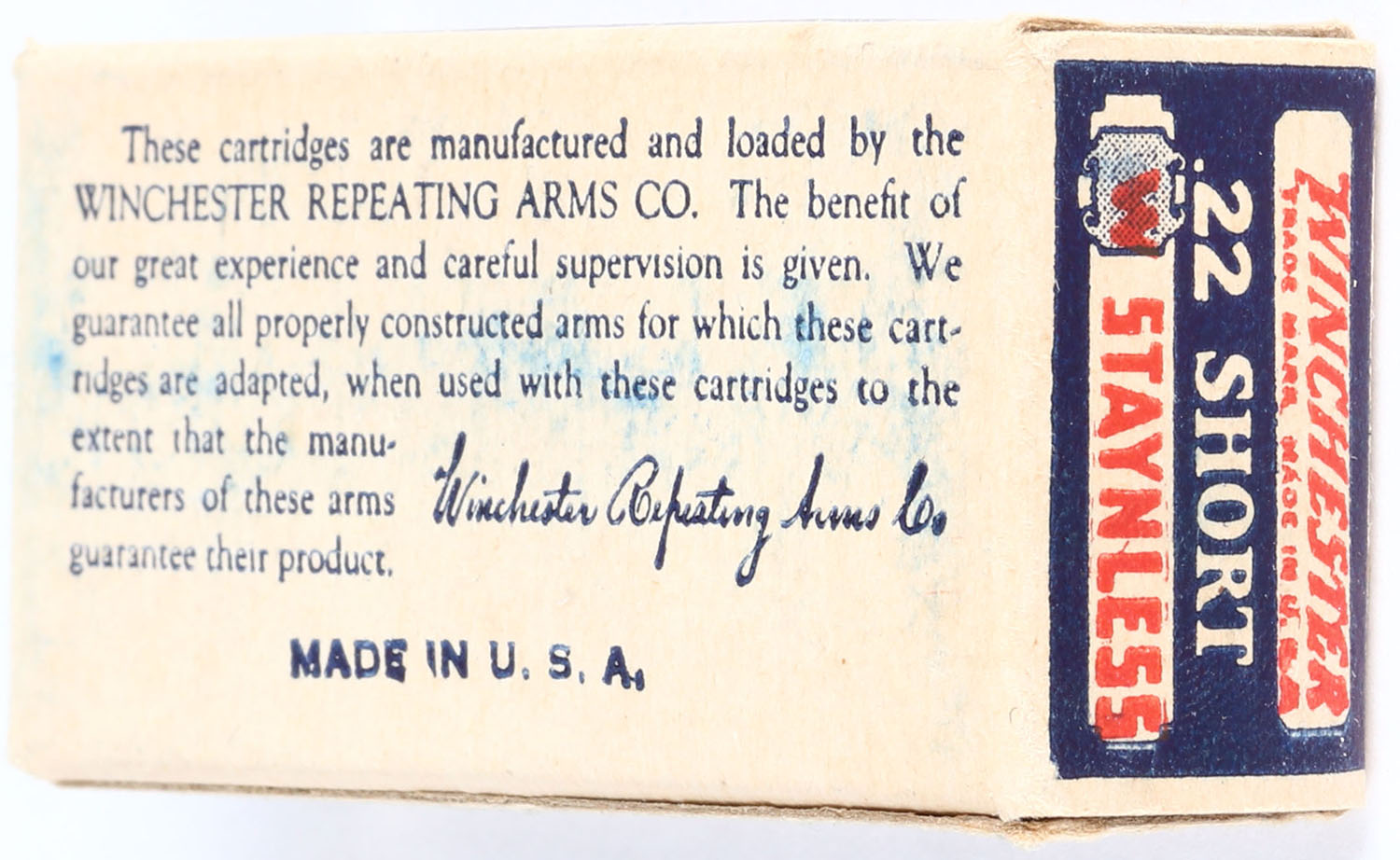Winchester, Staynless, .22 Short, WRA-12B S-1b, Full, 1pc. Blue white & red box, box is solid with excellent color, only very minor age soiling & corner wear, edges are crisp, end flaps are rigid, very minor color bleeding on bottom, ammo is excellent. Grade: Excellent ++ - Value: 70 to 200