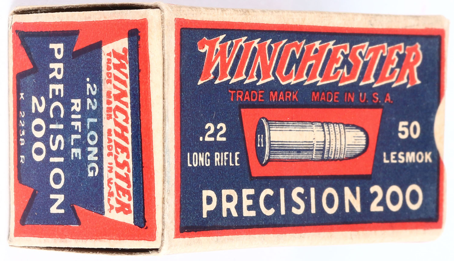 Winchester, Precision 200, .22 Long Rifle, Lesmok, RHWeb: WRA-53 LR-11e, Full, 1pc. Blue red & white box, box is solid with excellent colors, age soiling, very minor edge & corner wear, ammo is excellent. Grade: Excellent + - Value: 100 to 200