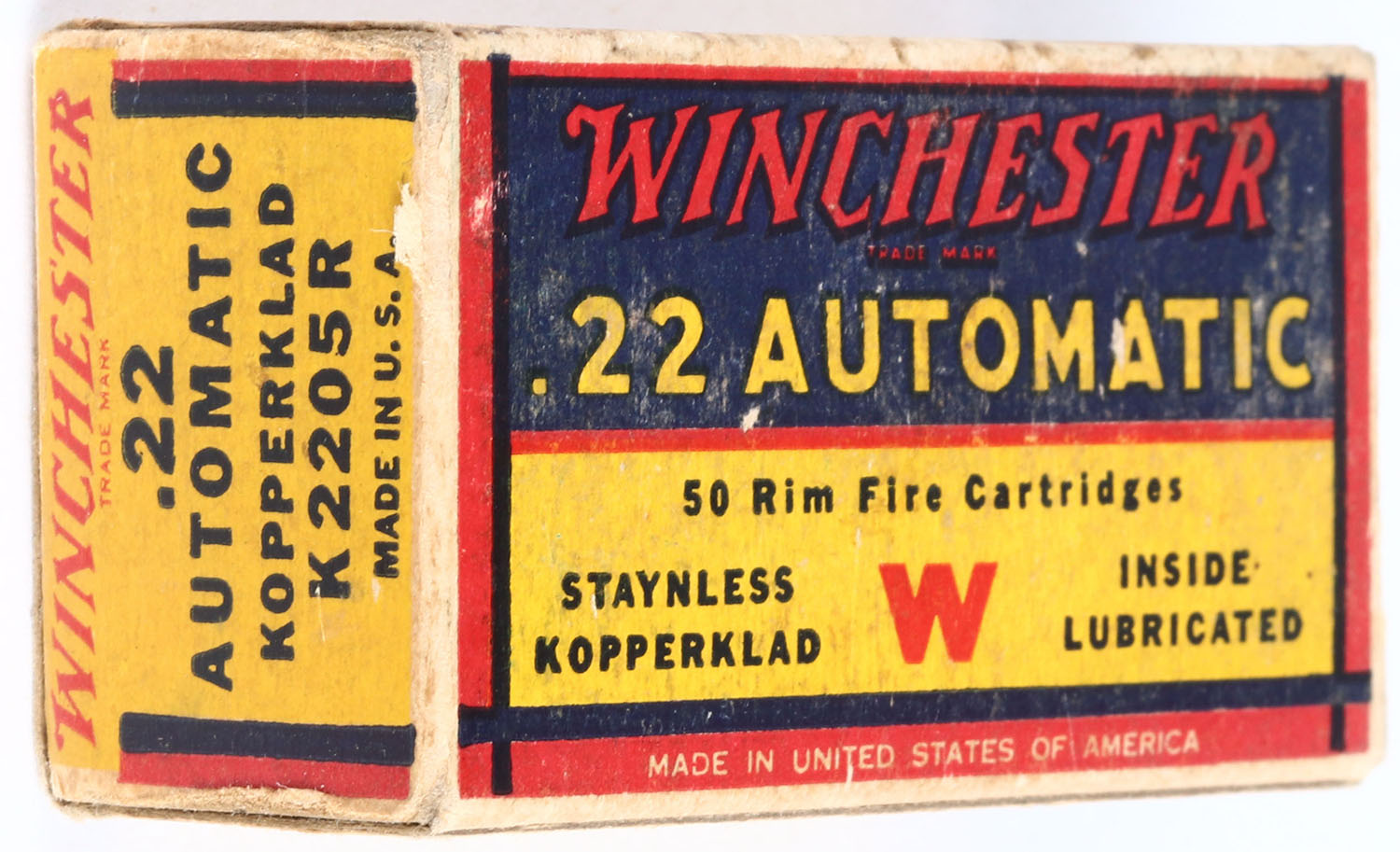 Winchester, .22 Automatic, Staynless Kopperklad, RHWeb: WRA-15 WA-1a, Full, 1pc. Yellow red & blue box, box is solid with very good to excellent color, some age soiling, minor corner wear, edges are mostly crisp, end flaps are solid, top has been written on, ammo is excellent. Grade: Very Good ++ - Value: 30 to 90