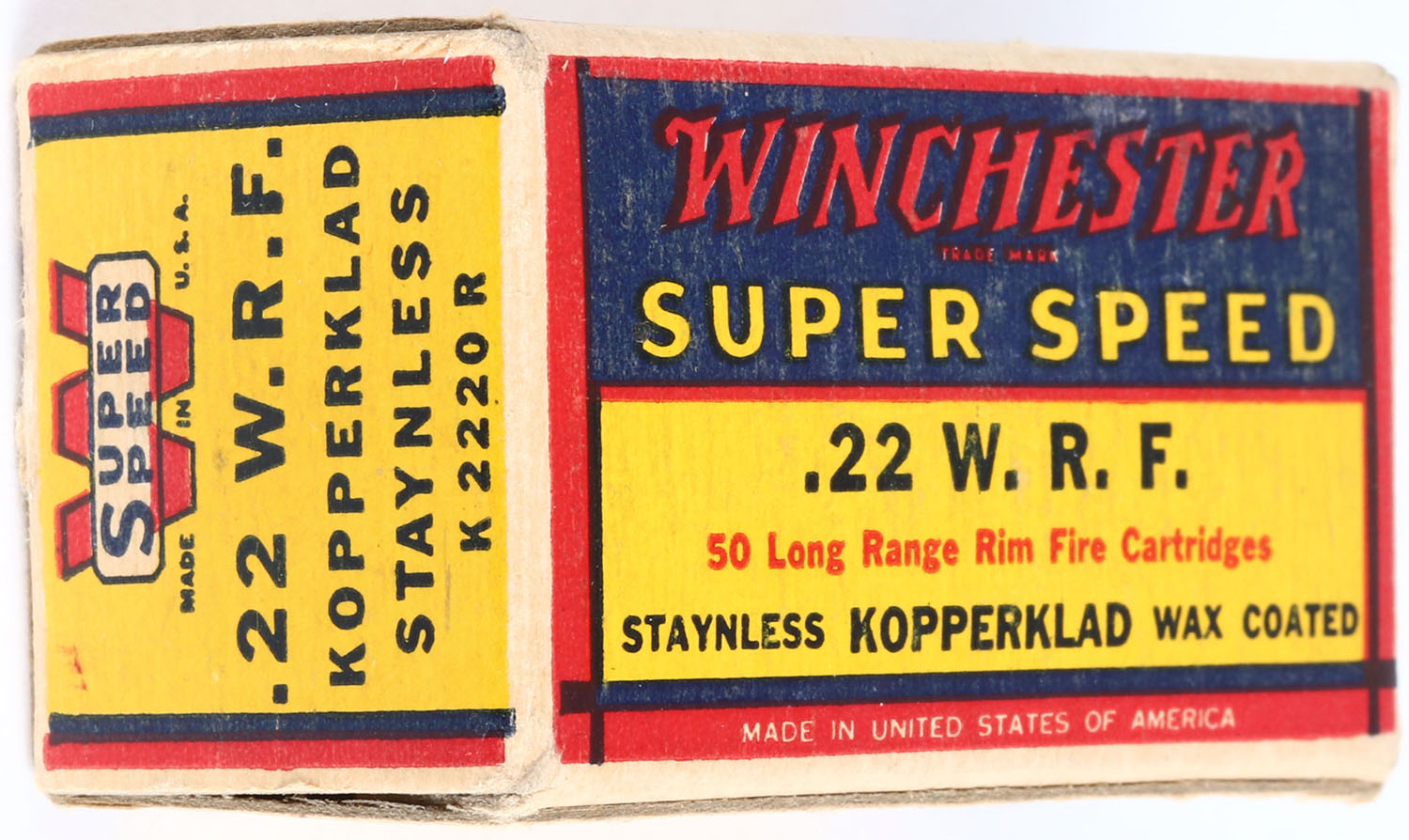 Winchester, Super Speed, .22 W.R.F., Staynless KopperKlad Wax Coated, RHWeb: WRF-1b, Full, 1pc. Yellow blue & red box, box is solid with excellent color, minor age soiling & shelf wear, very minor corner wear, edges are crisp, end flaps are rigid, ammo is excellent. Grade: Excellent + - Value: 20 to 60