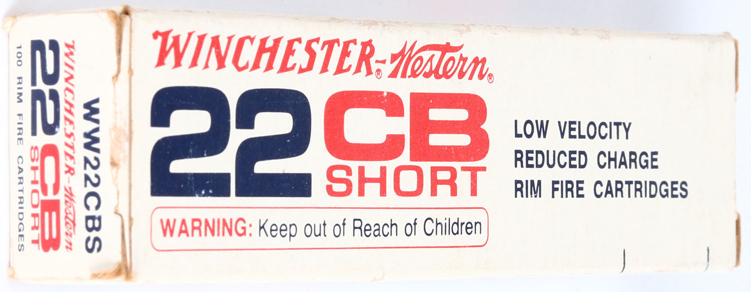 Winchester-Western, .22 CB Short, Low Velocity, Reduced Charge, RHWeb: WW-1 C-B-1, 100rds. Full, 1pc. White red & blue box, box is solid with excellent color, minor edge & corner wear, very minor shelf wear, end flaps are solid, ammo is excellent to minty. Grade: Excellent + - Value: 10 to 50