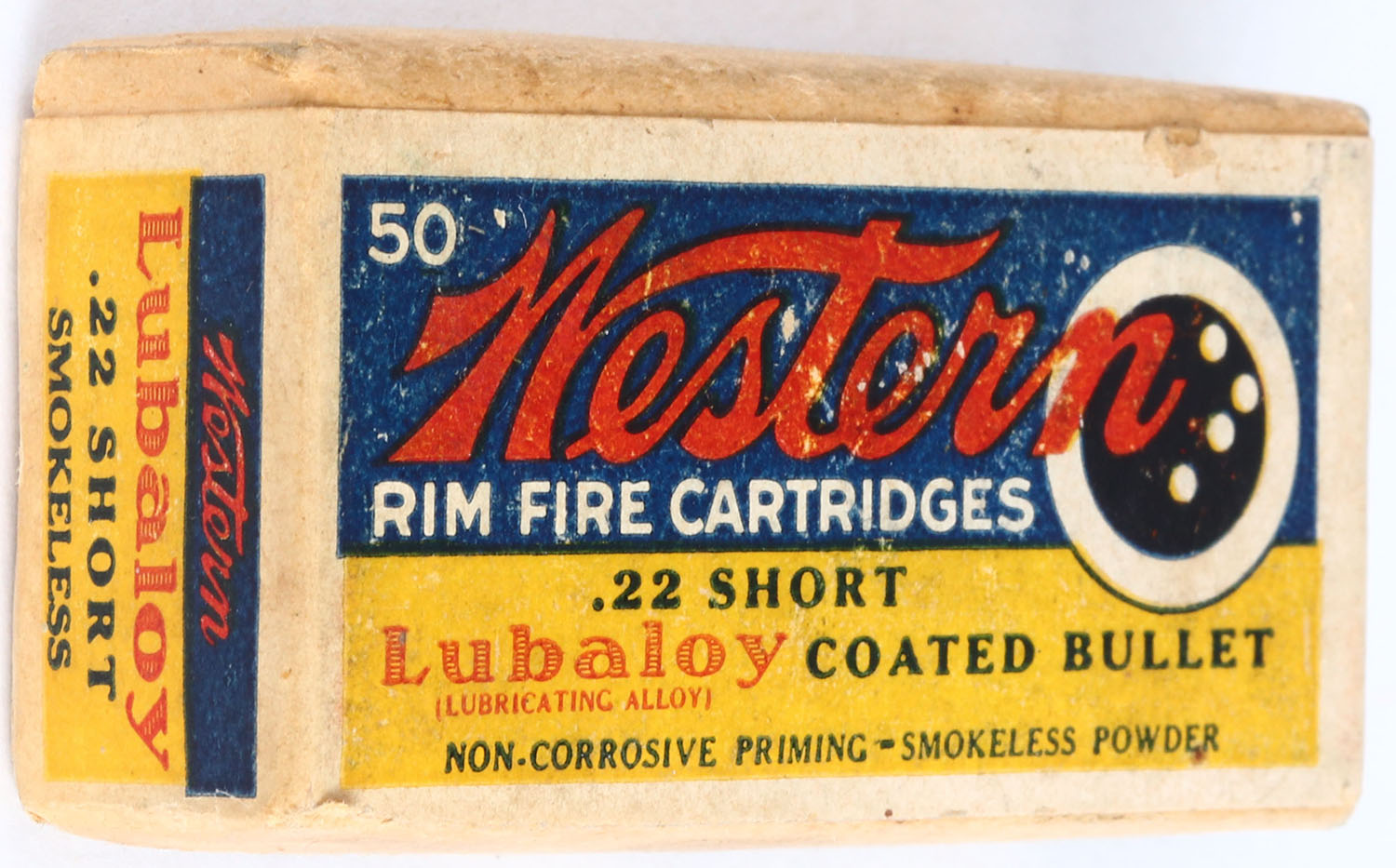 Western, .22 Short, Lubaloy Coated Bullet, RHWeb: WCC-4.2 S-1a, Full & Sealed, 2pc. Buff box with yellow blue & red wraparound label, box is solid with very good color, some age soiling, very minor shelf wear, edges are crisp, corners are mostly sharp, label is intact. Grade: Excellent + - Value: 100 to 200