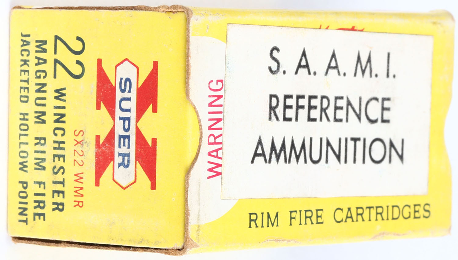 Western, Super X, .22 Winchester Magnum Rim Fire, Jacketed Hollow Point, S.A.A.M.I. Reference Ammunition, RHWeb: WCC-12 WMR-4, Full, 1pc. Yellow white & red box with white over-label, box is solid with excellent color, very minor age soiling, minor edge & corner wear, end flaps are solid, ammo is excellent to minty. Grade: Excellent + - Value: 20 to 80