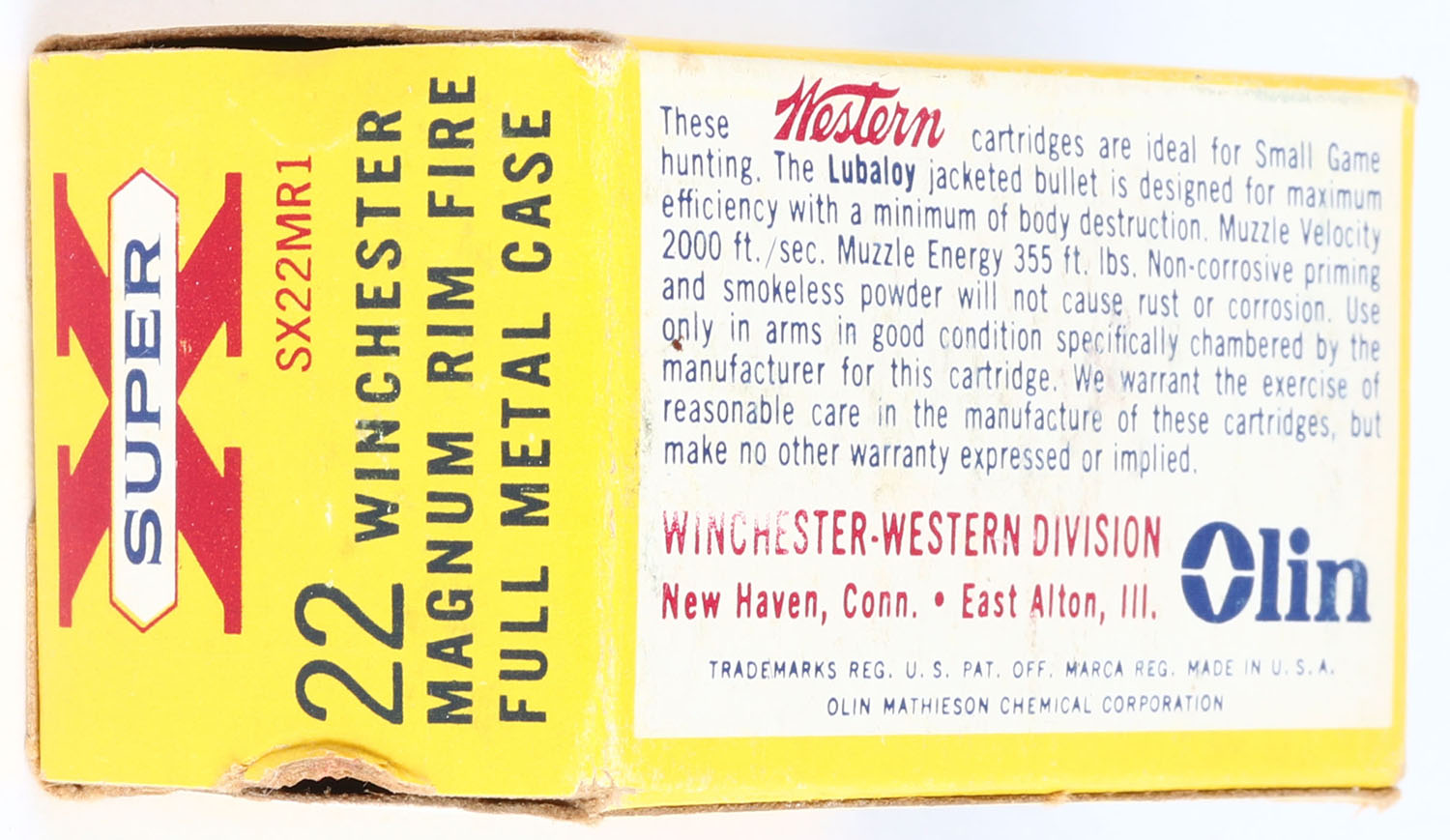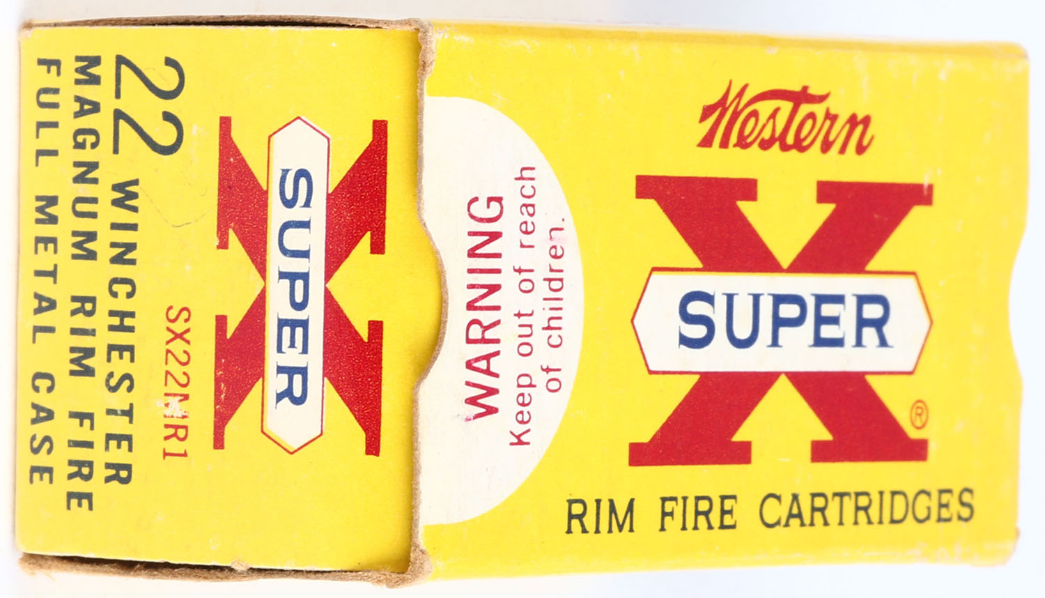 Western, Super X, .22 Winchester Magnum Rim Fire, RHWeb: WCC-12 WMR-3, Full, 1pc. Yellow white & red box, box is solid with excellent to minty color, corner ding on top front corner, otherwise, very minor corner wear, edges are crisp, end flaps are solid, ammo is excellent. Grade: Excellent + - Value: 10 to 50