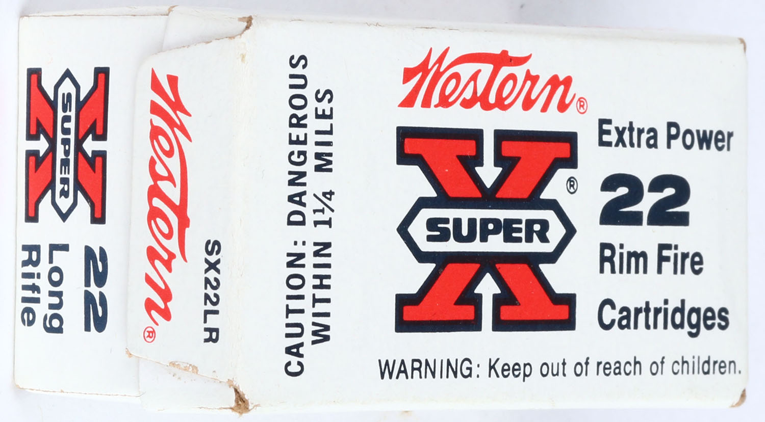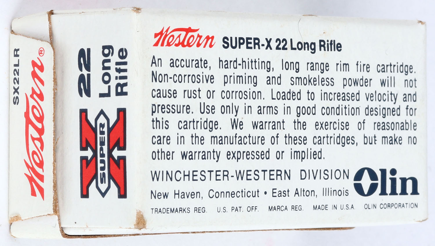 Western, Super X, .22 Long Rifle, Extra Power, RHWeb: Similar to WCC-13 LR-3 (Only the left end of top is not scored), FULL & SEALED, Experimental lift top 1pc. White box with red & black printing, box is solid with minty color, right end of top has come unglued, very minor corner wear, edges are crisp. Grade: Excellent + - Value: 16 to 60