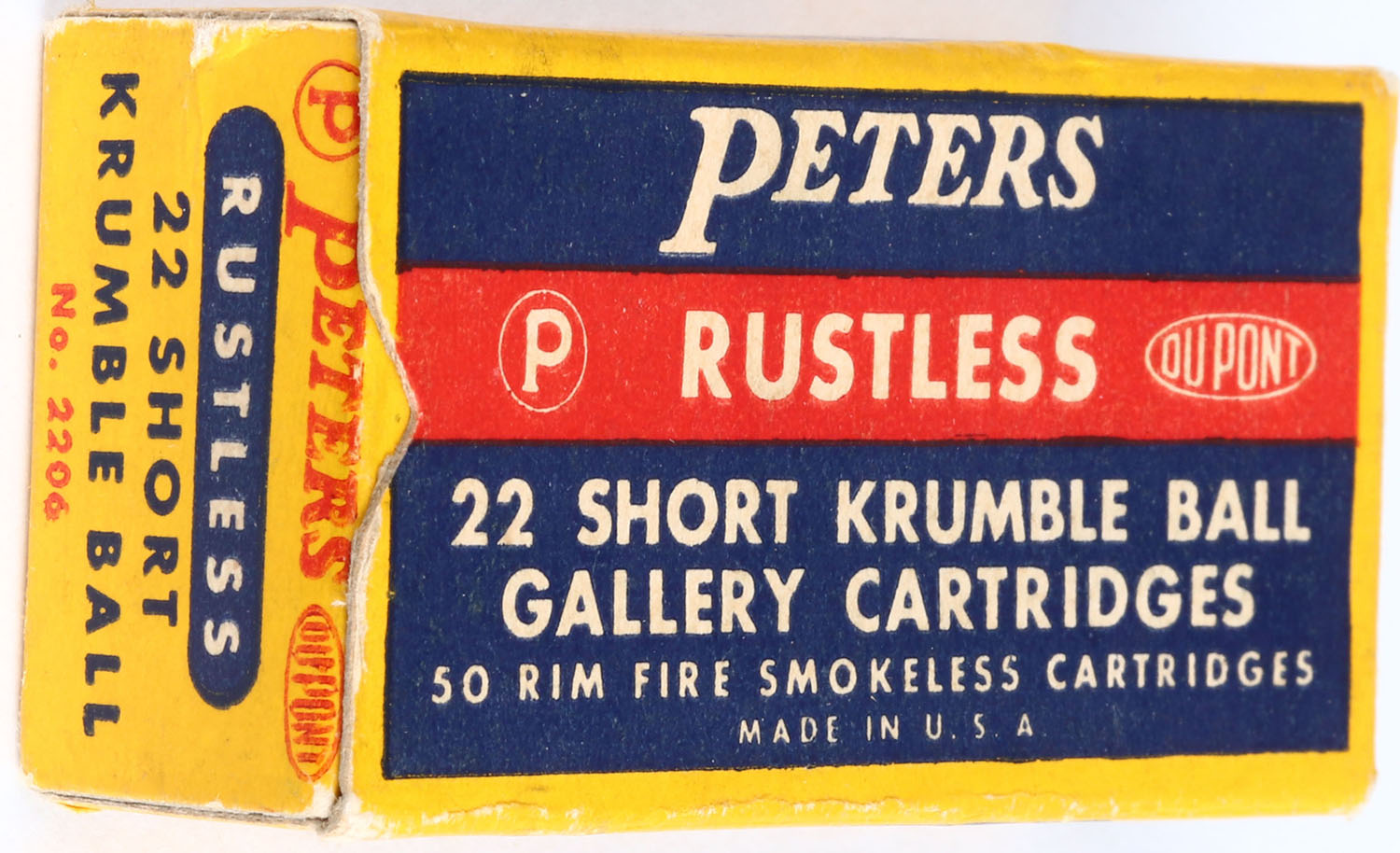 Rare! Peters, Rustless Krumble Ball, .22 Short Gallery Cartridges, RHWeb: PCC-29 S-2b, Full, 1pc. Blue yellow & red box, box is near mint with minty color, only very minor corner wear and the bottom is very slightly soiled, edges are crisp, end flaps are rigid, ammo is excellent. Grade: Excellent ++ - Value: 150 to 300