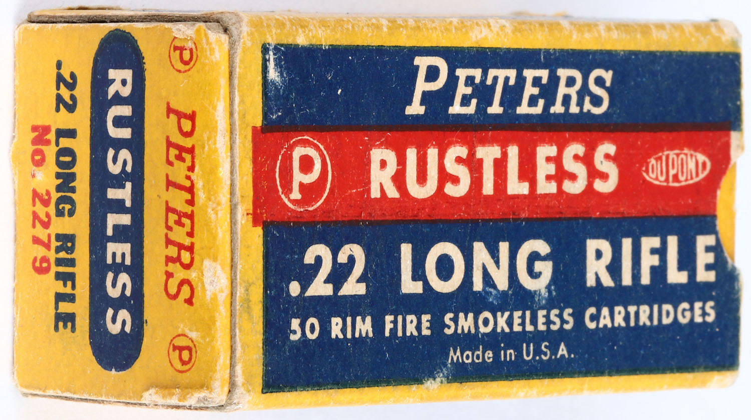Peters, Rustless, .22 Long Rifle, RHWeb: PCC-8D LR-3f.1, Full, 1pc. Blue yellow & red box, box is solid with excellent color, very minor age soiling & corner wear, edges are mostly crisp, end flaps are rigid, ammo is excellent. Grade: Excellent + - Value: 10 to 40