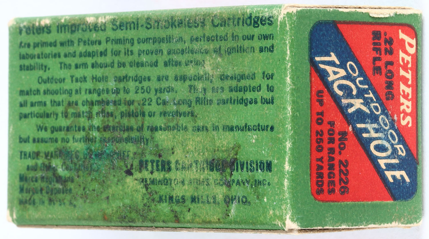 Peters, Outdoor Tack Hole, .22 Long Rifle, RHWeb: PCC-52 LR-10, Full, 1pc. Red green & blue box, box is solid with excellent color, some staining on bottom, very minor corner wear, edges are mostly crisp, end flaps are rigid, ammo is very good to excellent. Grade: Excellent + - Value: 100 to 300