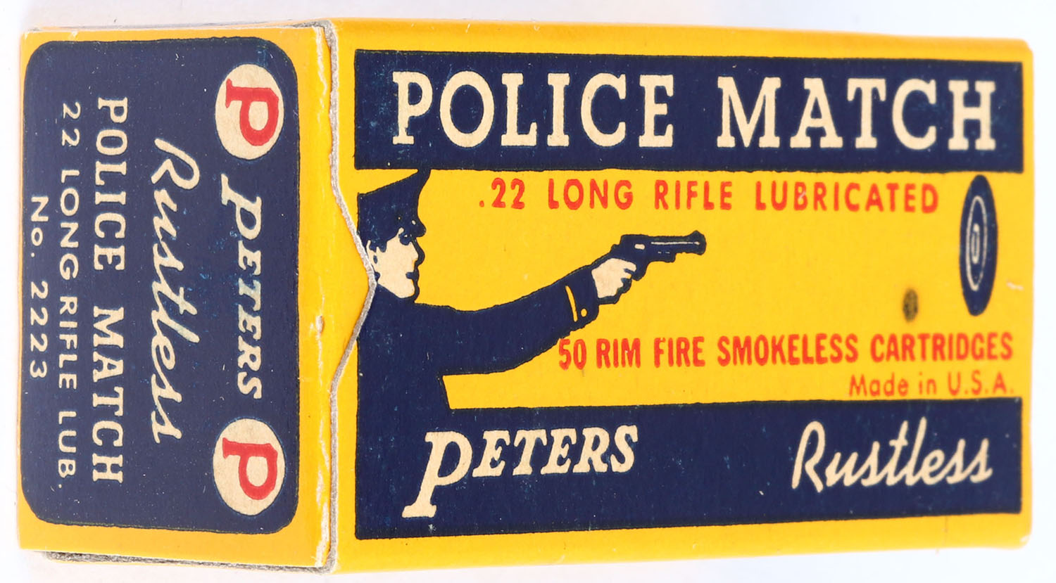 Peters, Police Match, .22 Long Rifle, RHWeb: PCC-53c LR-1b, Full, 1pc. Yellow blue & white box, box is near mint with minty color, only one very small blemish to top, corners are very sharp, edges are very crisp, end flaps are very rigid, ammo is excellent. Grade: MINT - Value: 50 to 150