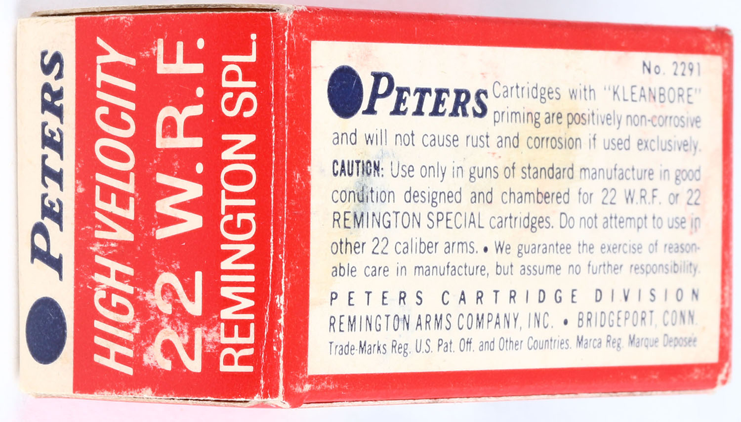 Peters, High Velocity, .22 W.R.F. Remington Spl., RHWeb: PCC-20 WRF-1b, Full, 1pc. Red white & blue box, box is solid with excellent color, very minor age soiling & shelf wear, top has been written on, corners are sharp, edges are crisp, end flaps are rigid, ammo is excellent. Grade: Excellent + - Value: 20 to 40
