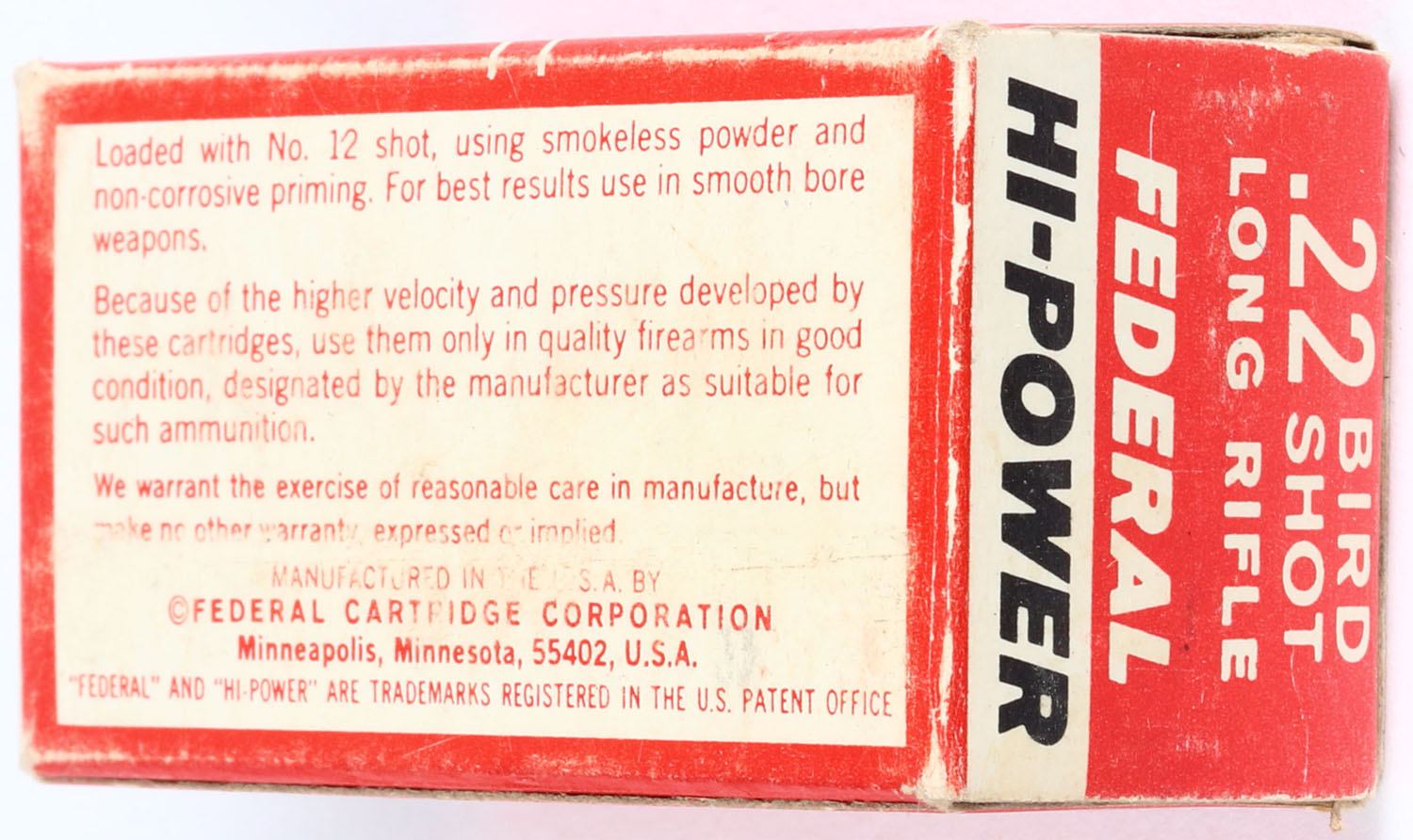 Federal, Hi-Power, .22 Long Rifle Shot, RHWeb: FED-9 LR-4b, Full, 1pc. Red white & black box, box is solid with very good color, some age soiling & shelf wear, minor corner wear, very minor edge wear, end flaps are solid, ammo is excellent. Grade: Excellent - Value: 10 to 50