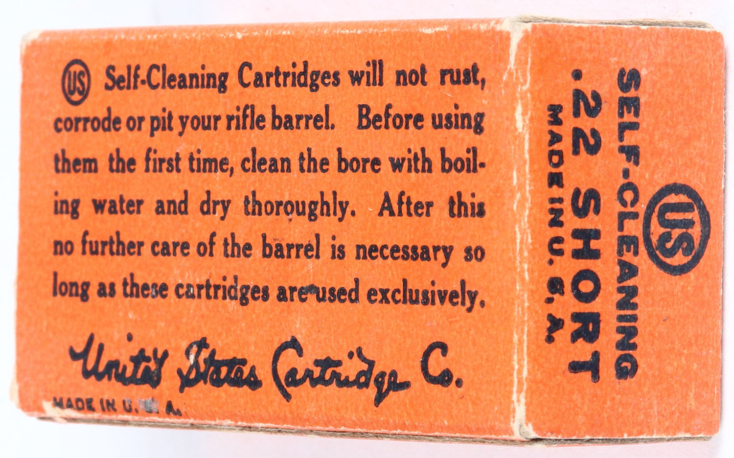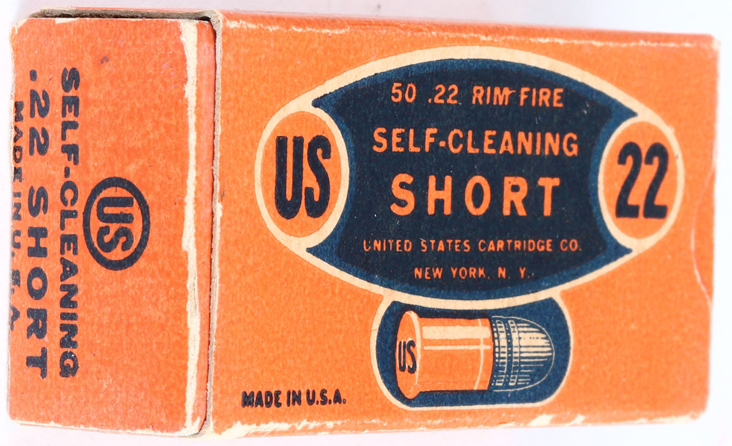 U.S., Self-Cleaning, .22 Short, RHWeb: US-10A S-1b, Full, 1pc. Orange, blue & white box, box is solid with very good to excellent color, minor age soiling, minor edge & corner wear, end flaps are solid, ammo is good to very good. Grade: Excellent + - Value: 50 to 100