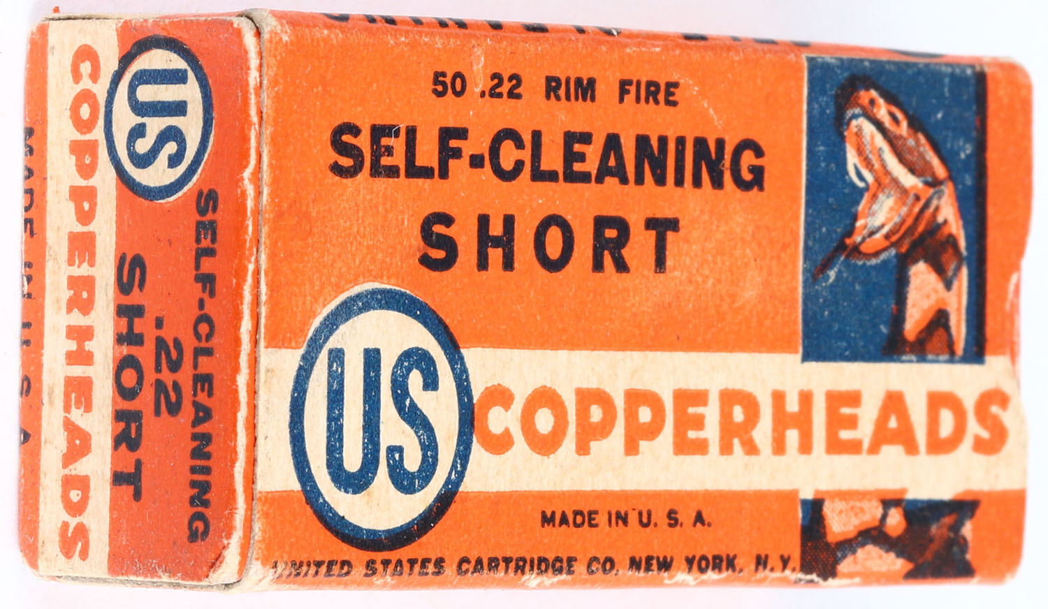 U.S., Copperheads, .22 Short, Self-Cleaning, RHWeb: US-12 S-1b, Full, 1pc. Orange white & blue box, box is solid with excellent color, very minor age soiling & corner wear, edges are mostly crisp, end flaps are solid, ammo is very good to excellent. Grade: Excellent + - Value: 30 to 90
