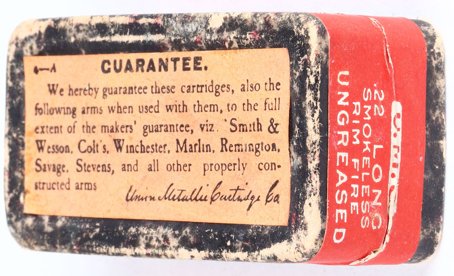 UMC, .22 Long, Smokeless Ungreased, RHWeb: UMC-9.5 L-1a, FULL & SEALED, 2pc. Black mottled box with orange top & side sealing label and salmon colored bottom label, box is solid with excellent to near mint color, only very minor age soiling, minor edge wear, some shelf wear to bottom, all labels have excellent to minty color, all labels are intact. Grade: Excellent ++ - Value: 100 to 300
