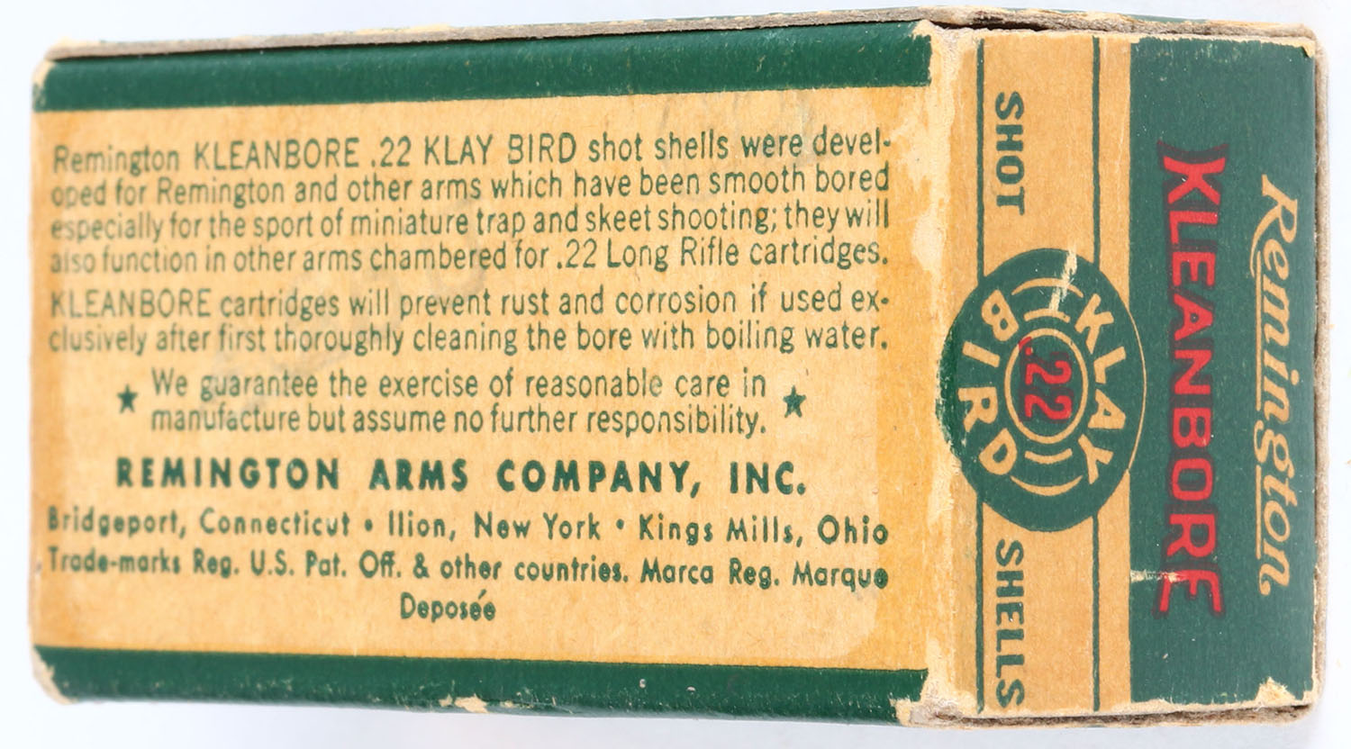 Remington, Kleanbore Hi-Speed, .22 Klay Bird, Long Rifle Shot, RHWeb: REM-10 LR-3a, Full, 1pc. Green white & red box, box is solid with excellent color, very minor age soiling, some corner wear, edges are mostly crisp, end flaps are rigid, ammo is excellent. Grade: Excellent + - Value: 30 to 90