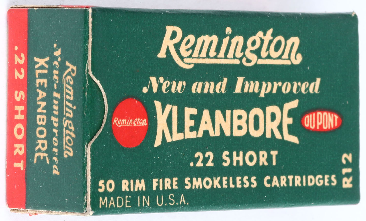 Remington, New and Improved Kleanbore, .22 Short, RHWeb: REM-11 S-1, Full, 1pc. Green white & red box, box is near mint with excellent color, only very minor age soiling, corners are sharp, edges are crisp, end flaps are solid, ammo is excellent. Grade: Excellent ++ - Value: 6 to 30