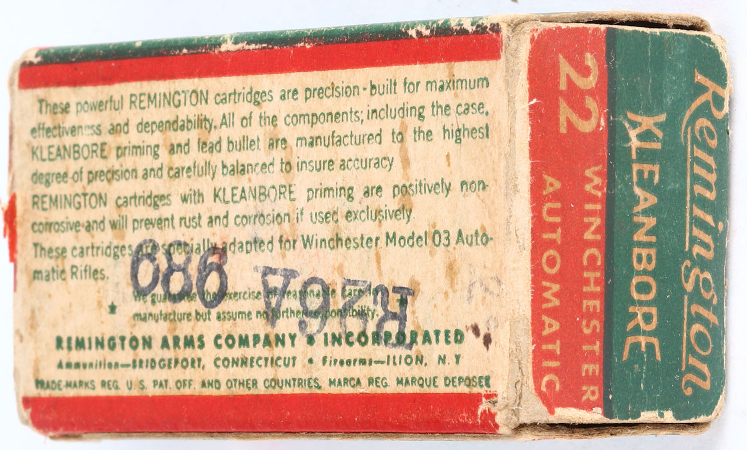 Remington, Kleanbore, .22 Winchester Automatic, RHWeb: REM-12 WA-1a, Full, 1pc. Green white & red box, box is solid with excellent color, very minor age soiling, some edge & corner wear, end flaps are fairly rigid, ammo is excellent. Grade: Excellent - Value: 10 to 50