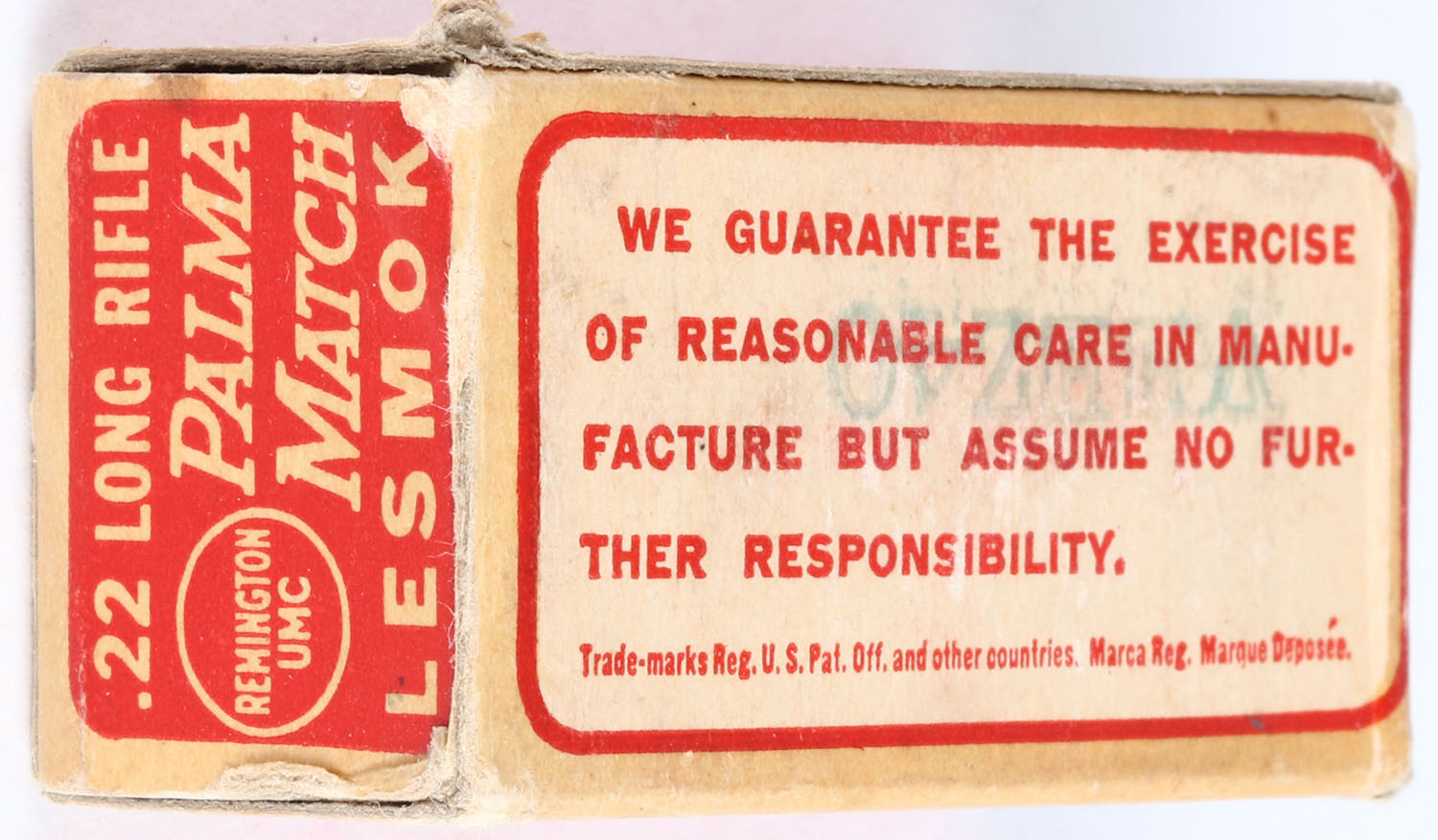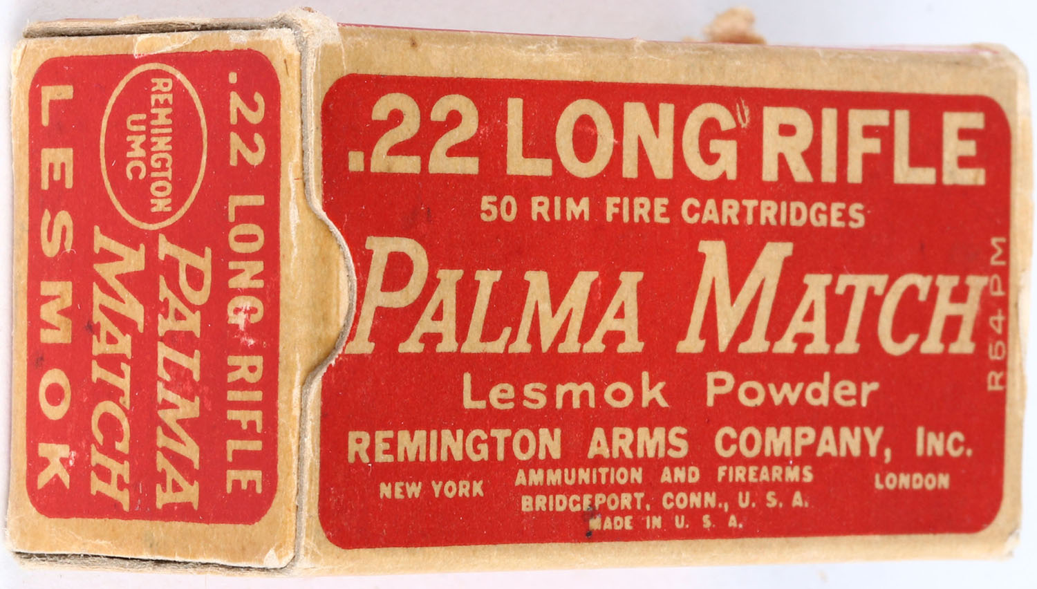 Remington, Palma Match, .22 Long Rifle, Lesmok Powder, RHWeb: RHWeb: REM-52 LR-5d, Full, 1pc. Red & buff box, box is solid with excellent color, some age soiling, very minor corner wear, right end flap has partial seam split, edges are crisp, left end flap is rigid, ammo is excellent. Grade: Excellent - Value: 8 to 40