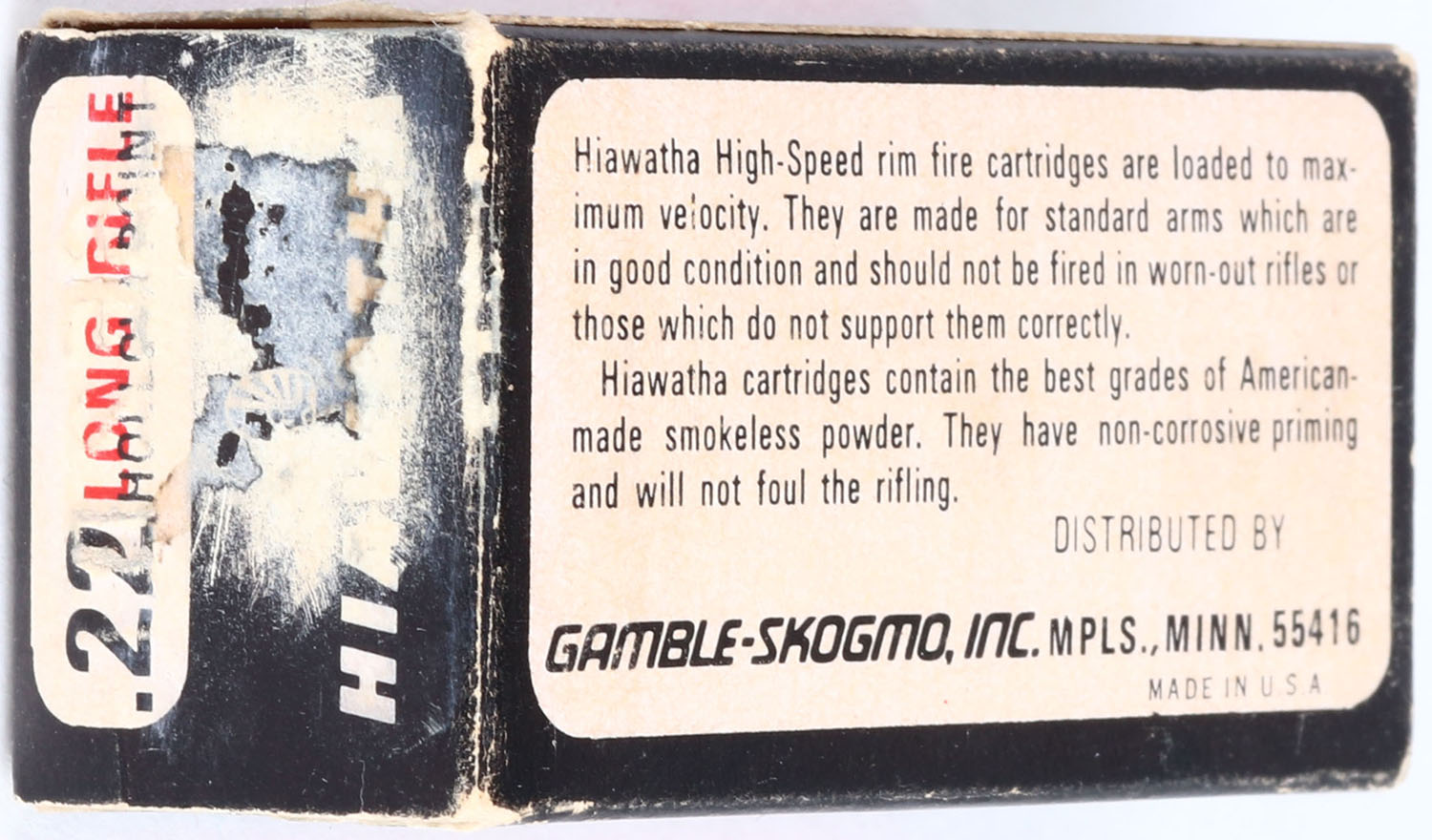 Gamble Stores, Hiawatha, .22 Long Rifle Hollow Point, RHWeb: GS-5 LR-2b, Full, 1pc. Black white & red rabbit box, box is solid with minty color, very minor edge & corner wear, end flaps are solid, ammo is minty. Grade: Excellent ++ - Value: 20 to 60