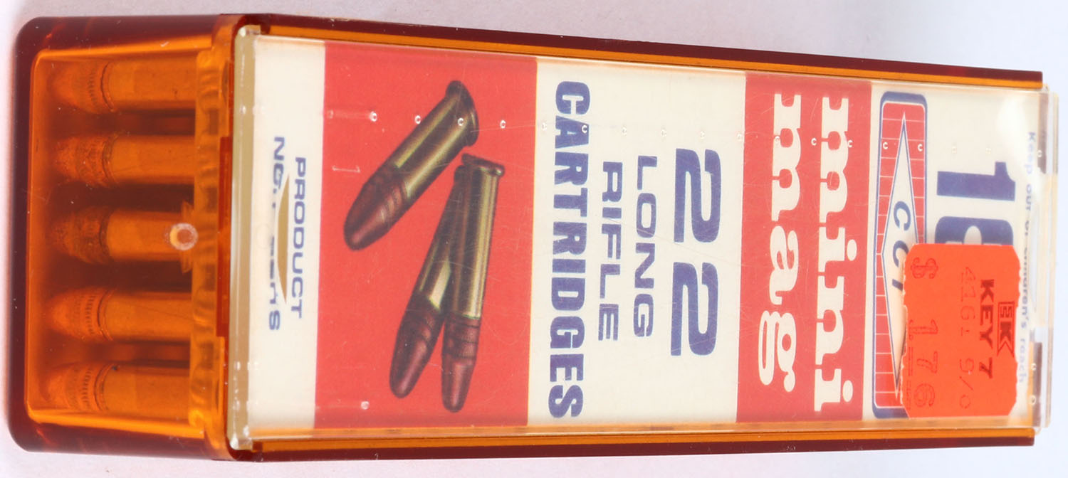 CCi, mini mag, .22 Long Rifle, RHWeb: CCI-4 LR-7b, Full, 2pc. Amber plastic tray with red & white label, box is MINT with minty color, Key 7 price tag on top, ammo is mint. Grade: MINT - Value: 10 to 40