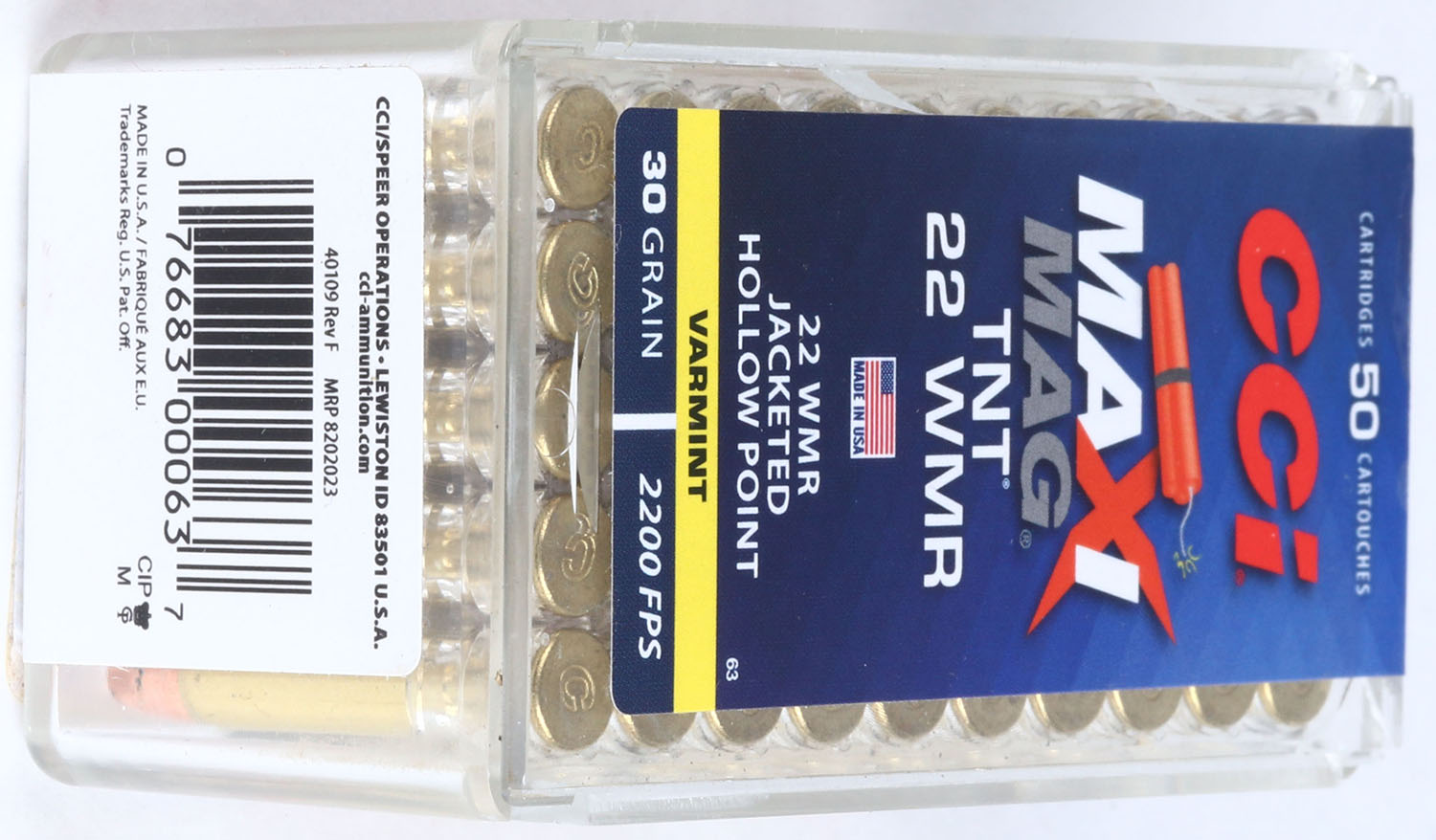 CCi, Maxi Mag TNT, .22 WMR, FULL & SEALED, 2pc. Clear plastic tray with blue sealing label, box is cracked, label is mint. Grade: Excellent - Value: 8 to 40