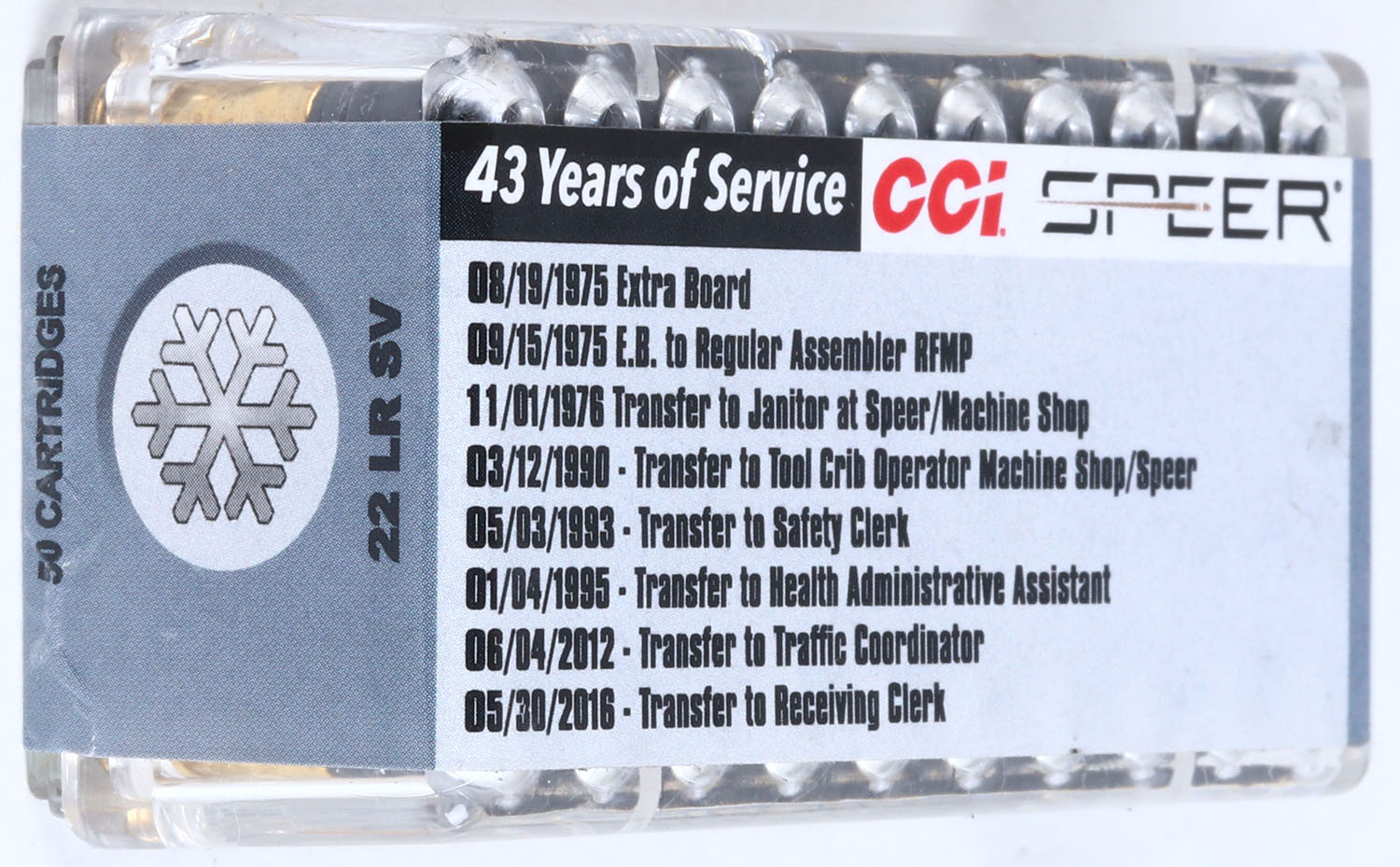 CCi, April Smith Retirement Commemorative box, .22 Long Rifle, Standard Velocity, FULL & SEALED, 2pc. Clear plastic tray with multicolored label that features April in front of a snow sculpture, box has one crack on front and one on back that both appear to be superficial, label is intact with minty color, ammo is mint. Grade: Excellent + - Value: 40 to 120