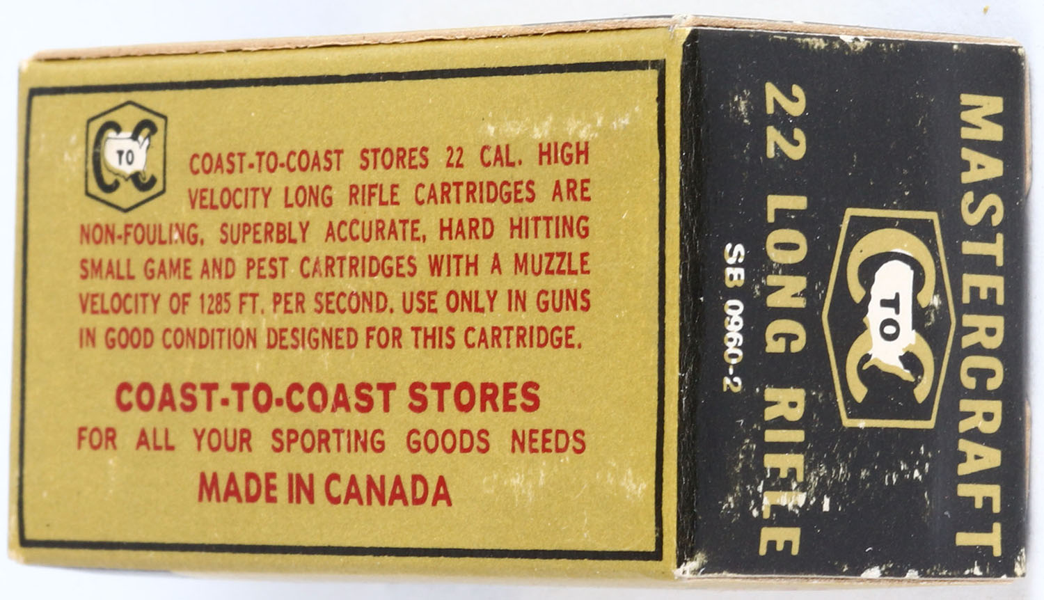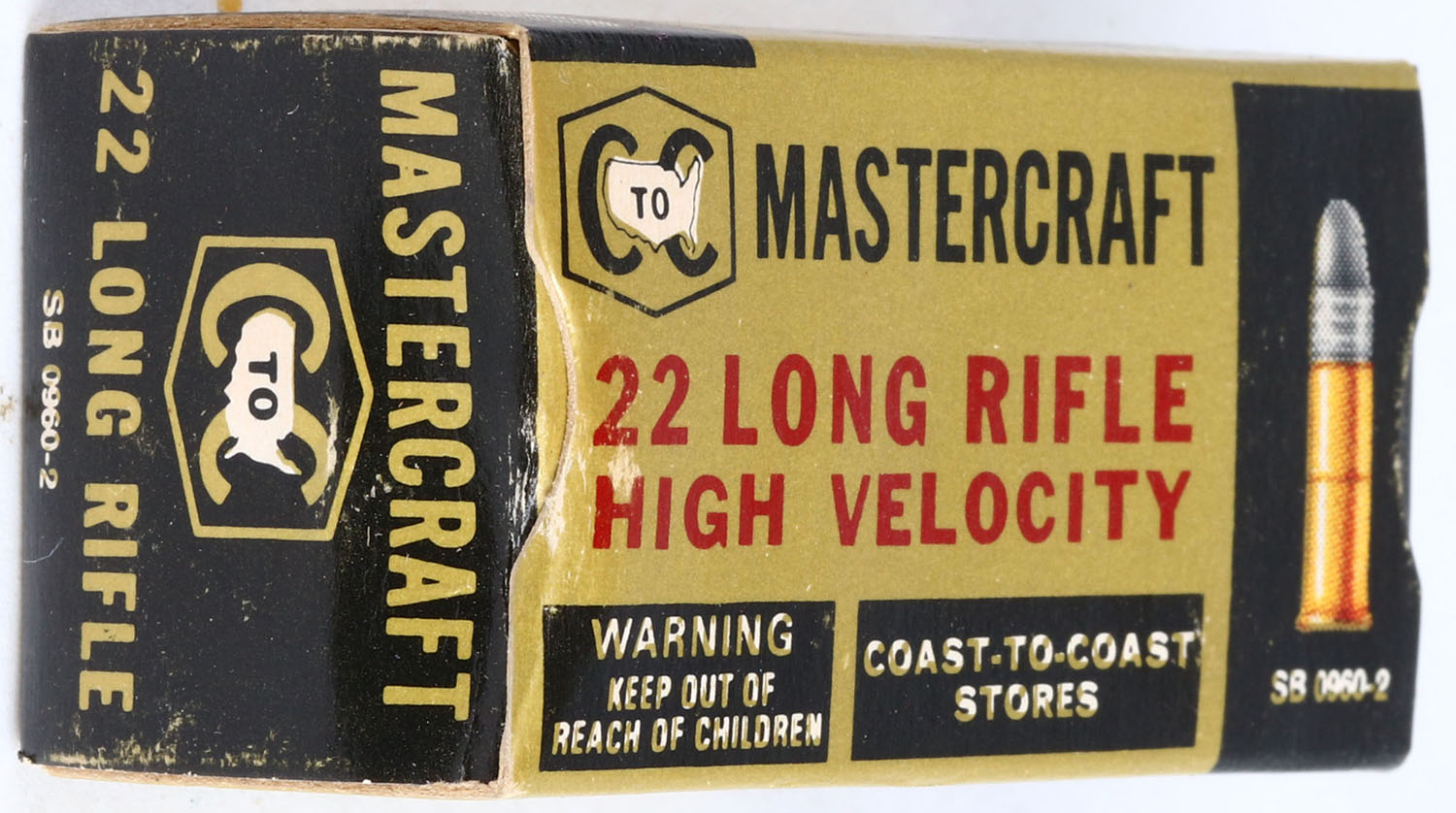 Coast to Coast, Mastercraft, .22 Long Rifle, High Velocity, RHWeb: CTC-1 LR-2b, Full, 1pc. Gold black & red box, box is near mint with minty color, only very minor shelf wear, corners are sharp, edges are crisp, end flaps are rigid, ammo is very good. Grade: Excellent ++ - Value: 6 to 30