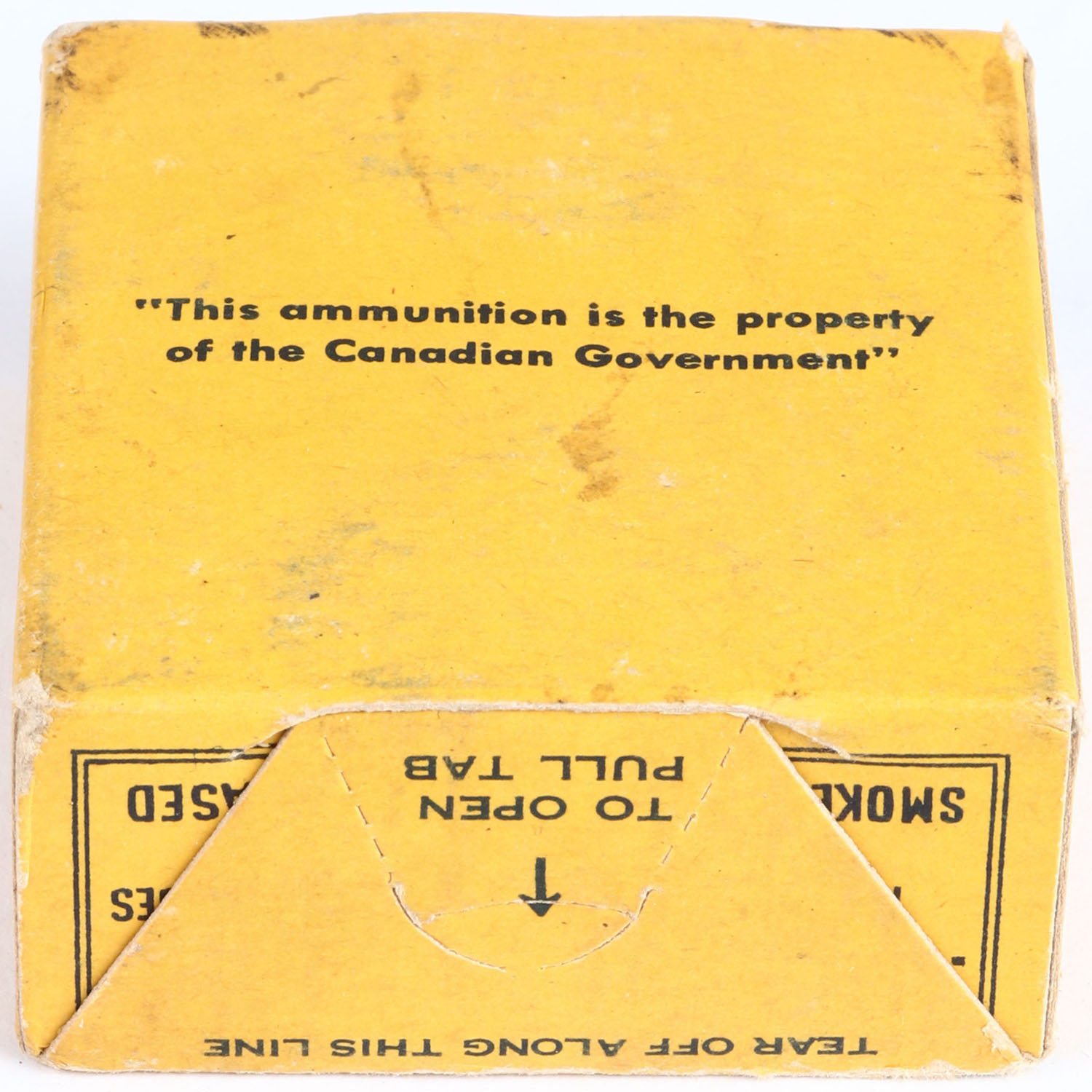 CIL, .22 Long Rifle, RHWeb: CIL-2 LR-9c, Full, 1pc. Yellow & blue box, box is solid with excellent color, very minor age soiling front flap is torn, edges are mostly crisp, back flap is solid, ammo is very good. Grade: Excellent - Value: 20 to 60