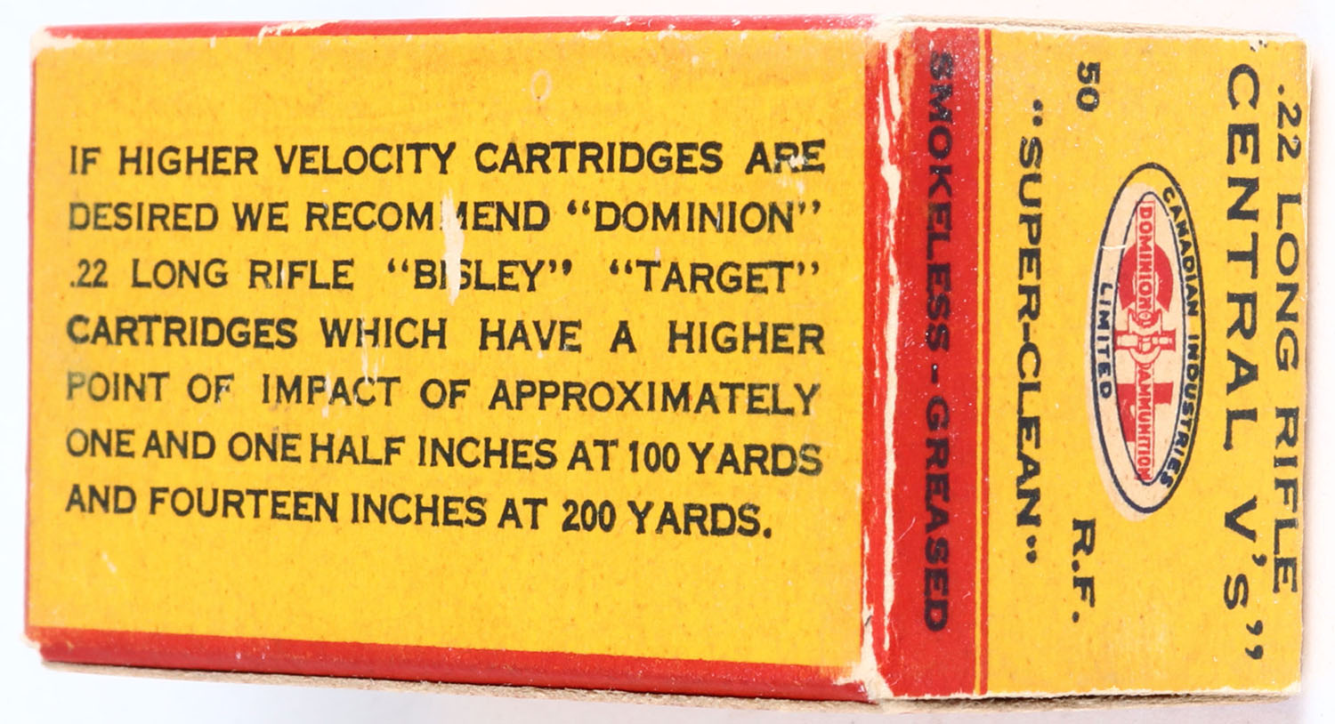 CIL, Central V's, .22 Long Rifle, Super-Clean, RHWeb: CIL-2 LR-14, Full, 1pc. Yellow & red box, box is solid with excellent color, only very minor age soiling, corners are sharp, edges are crisp, end flaps are rigid, ammo is very good. Grade: Excellent ++ - Value: 20 to 60