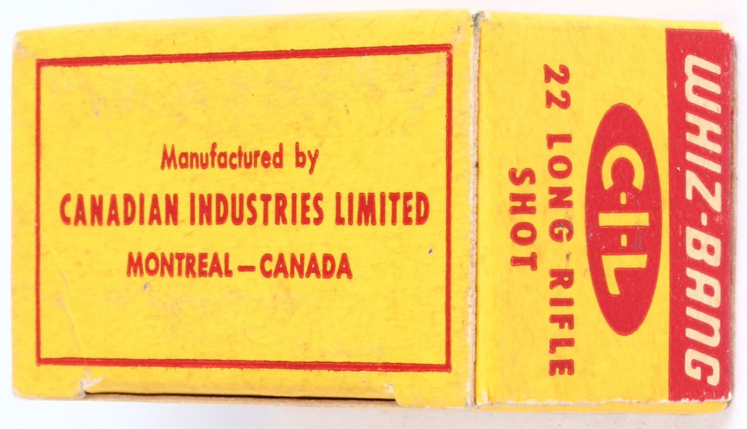 CIL, Whiz-Bang, .22 Long Rifle Shot, High Velocity, RHWeb: CIL-6 LR-4, Full, 1pc. Yellow & red box, box is solid with excellent to minty color, minor edge wear, corners are sharp, top flap is solid, ammo is minty. Grade: Excellent ++ - Value: 50 to 150