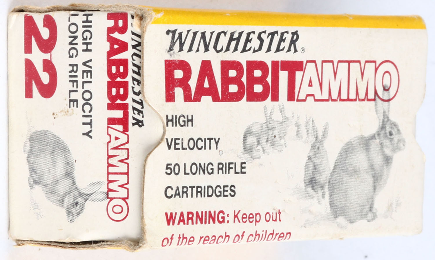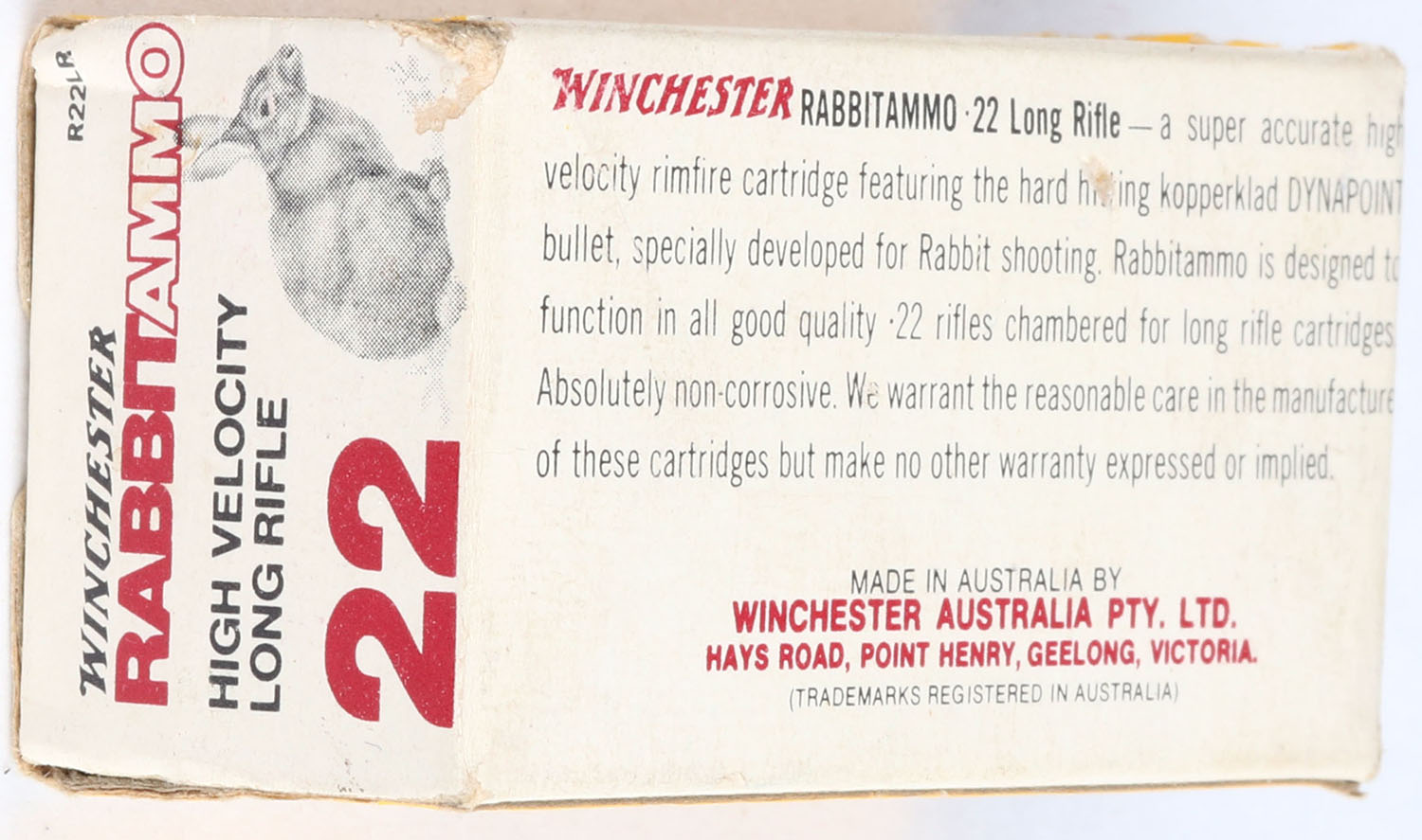 Winchester (Australia), Rabbit Ammo, .22 Long Rifle, High Velocity, RHWeb: (Australia) RABBIT-1 LR-1a, Full, 1pc. White yellow & red box, box is solid with excellent to minty color, only very minor age soiling, corner wear, very minor edge wear, end flaps are solid, ammo is minty. Grade: Excellent + - Value: 50 to 150