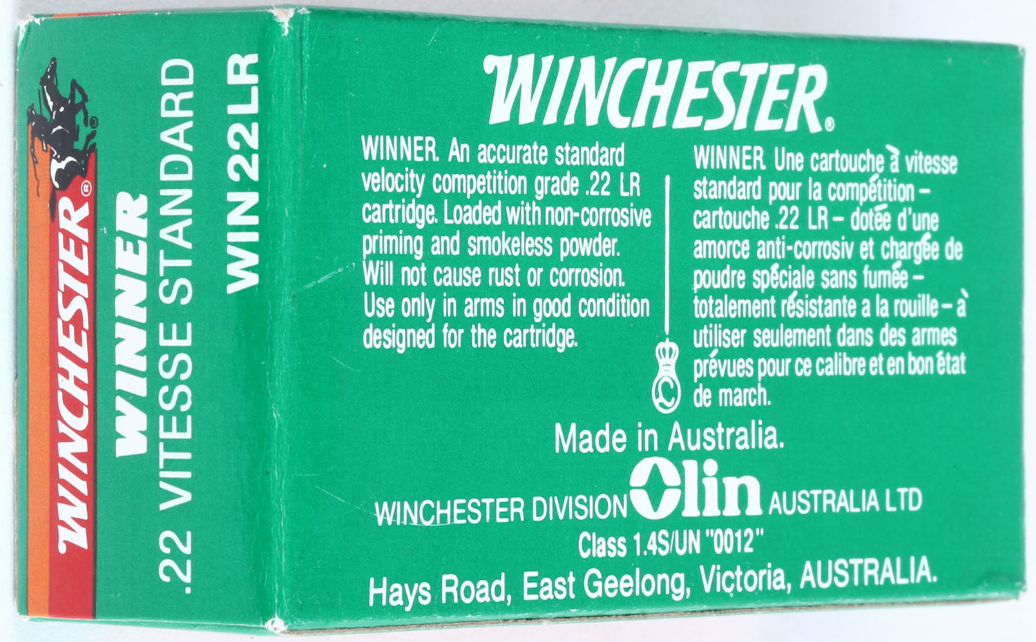 Winchester (Australia), Winner .22, .22 Long Rifle, Standard Velocity, RHWeb: (Australia) WIN-1 LR-2, Full, 1pc. Green white & red box, box is MINT with minty color, sharp corners, crisp edges, rigid end flaps, ammo is minty. Grade: MINT - Value: 20 to 60