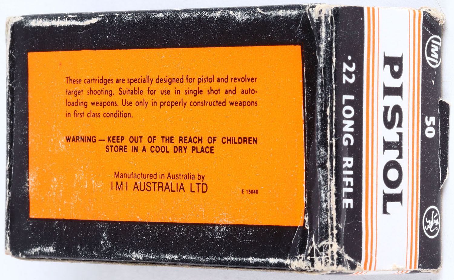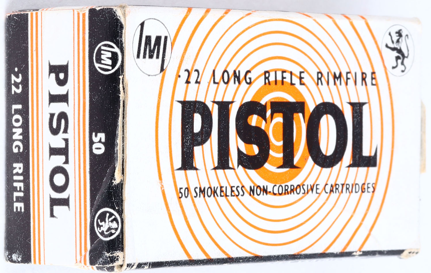 IMI, Pistol, .22 Long Rifle, Reduced Velocity, RHWeb: (Australia) PISTOL-1 LR-12, Full, 1pc. White black & orange box, box is solid with excellent color, minor shelf wear, corner wear, edges are mostly crisp, end flaps are solid, ammo is excellent. Grade: Excellent - Value: 8 to 40