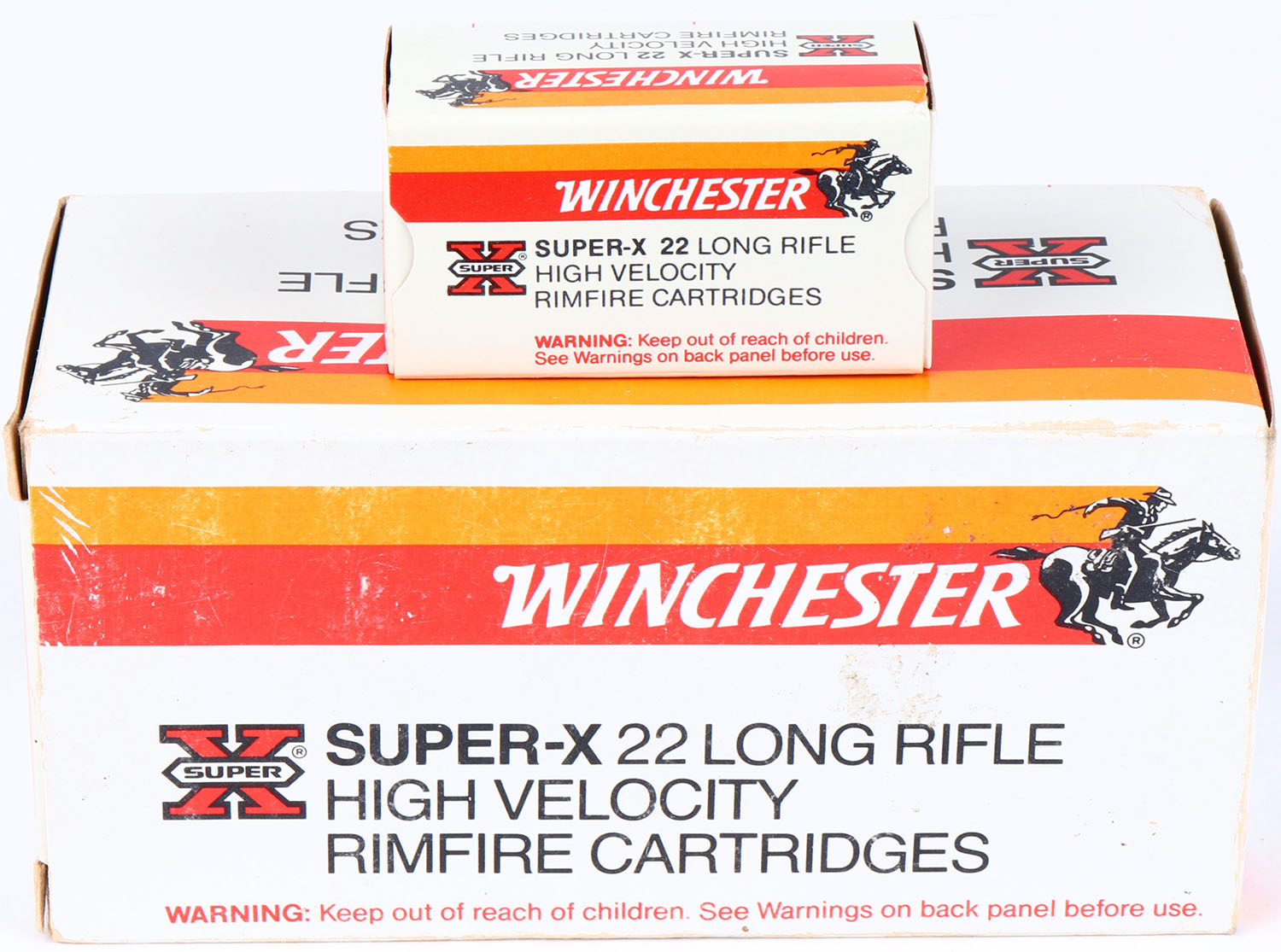 Winchester, Super-X, .22 Long Rifle, High Velocity, Full, 500rds. 1pc. White red & orange brick with black printing, brick is solid with excellent color, very minor shelf & edge wear, very minor corner wear, end flaps are solid, inside boxes are minty. Grade: Excellent + - Value: 30 to 60