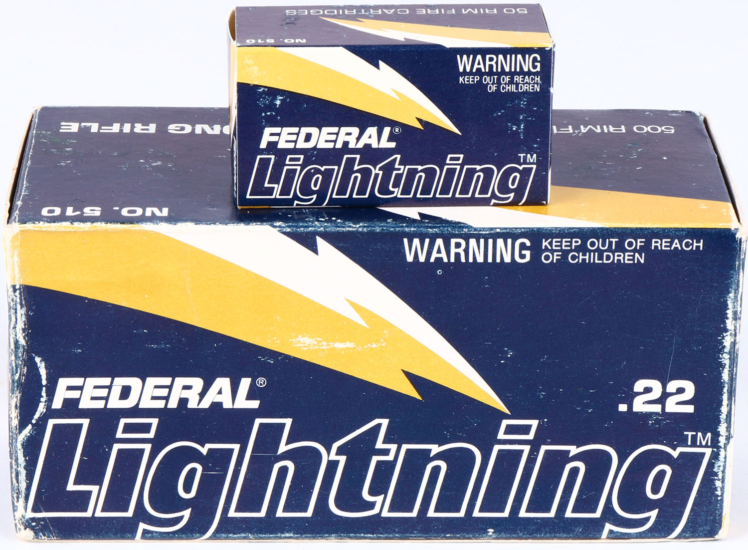 Federal, Lightning, .22 Long Rifle, Full, 500rds. 1pc. Blue white & gold brick, brick is solid with excellent color, corner wear, some shelf & edge wear, end flaps are solid, inside boxes are minty. Grade: Excellent + - Value: 20 to 60